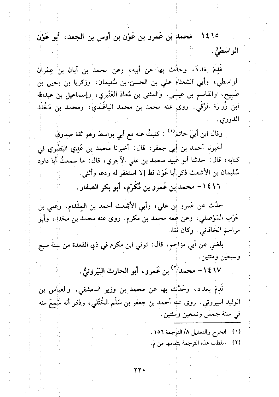1415 - محمد بن عمرو بن عون بن أوس بن الجعد أبو عون الواسطي قدم بغداد، وحدث بها عن أبيه، وعن محمد بن أبان بن عمران الواسطي وأبي الشعثاء علي بن الحسن بن سليمان وزكريا بن يحيى بن صبيح والقاسم بن عيسى والمثنى بن معاذ العنبري وإسماعيل بن عبد الله بن زرارة الرقى.