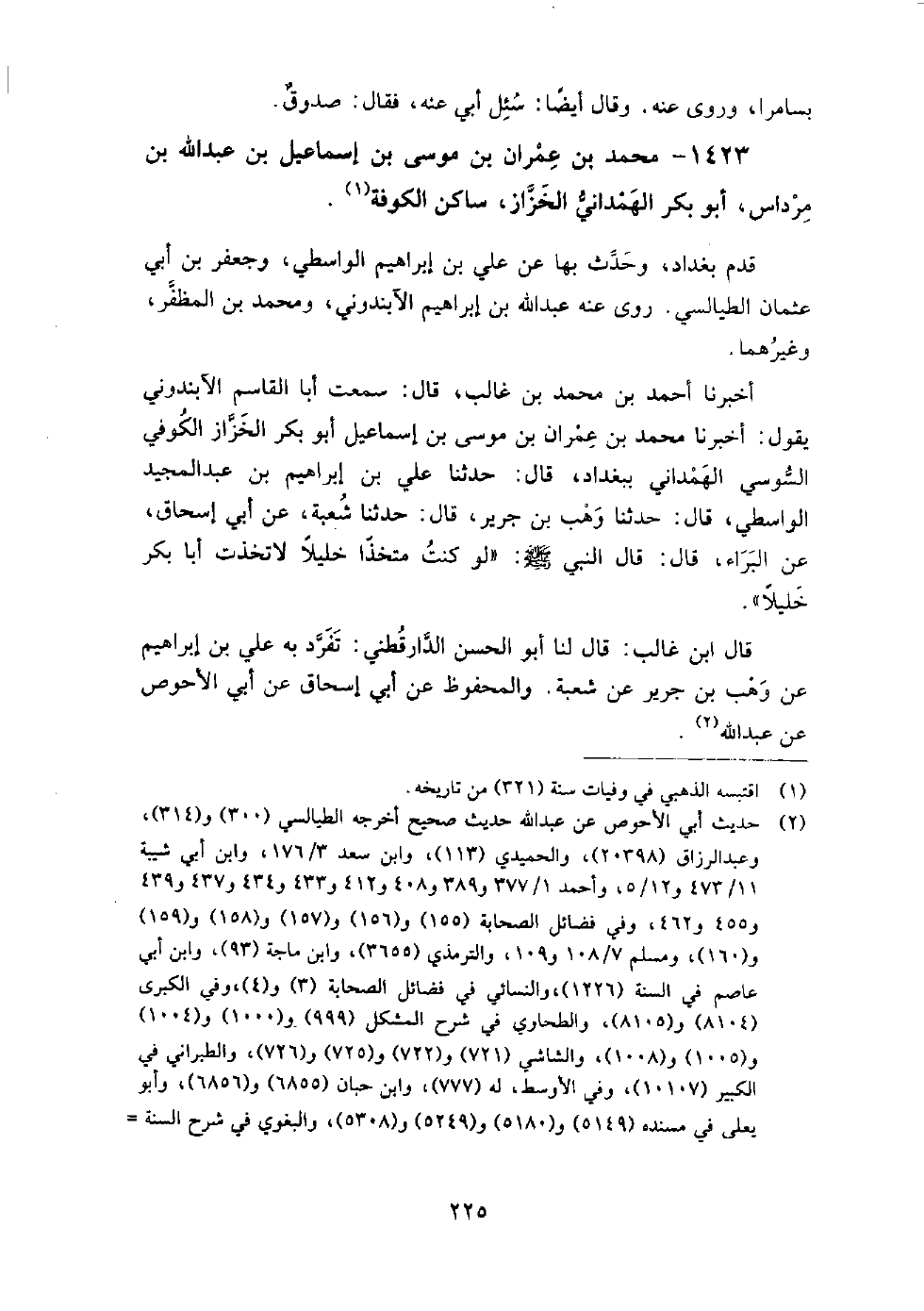 1423 - محمد بن عمران بن موسى بن إسماعيل بن عبد الله بن مرداس، أبو بكر الهمداني الخزاز ساكن الكوفة قدم بغداد، وحدث بها عن علي بن إبراهيم الواسطي، وجعفر بن أبي عثمان الطيالسي.