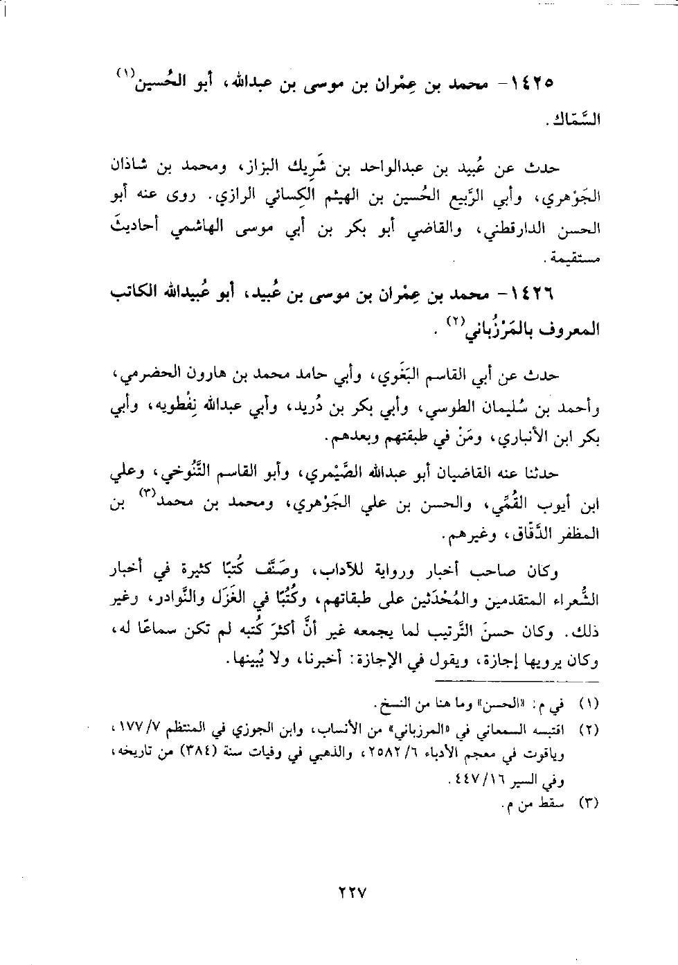 1426 - محمد بن عمران بن موسى بن عبيد أبو عبيد الله الكاتب المعروف بالمرزباني حدث عن أبي القاسم البغوي، وأبي حامد محمد بن هارون الخضرمي، وأحمد بن سليمان الطوسي، وأبي بكر بن دريد، وأبي عبد الله نفطويه، وأبي بكر ابن الأنباري، ومن طبقتهم وبعدهم.