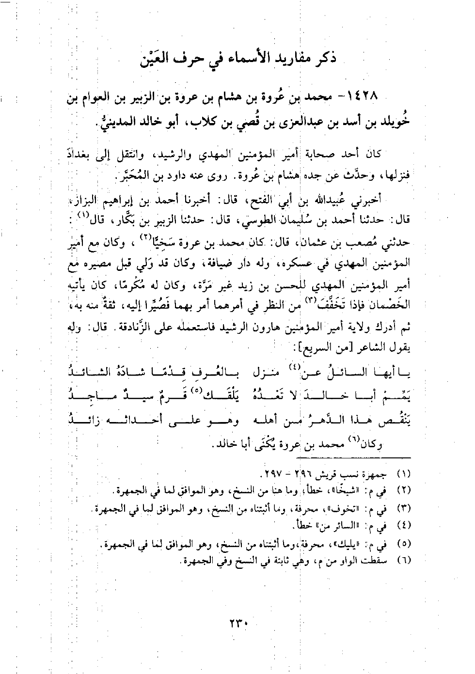 1428 - محمد بن عروة بن هشام بن عروة بن الزبير بن العوام بن خويلد بن أسد بن عبد العزى بن قصي بن كلاب أبو خالد المديني كان أحد صحابة أمير المؤمنين المهدي والرشيد، وانتقل إلى بغداد فنزلها، وحدث عن جده هشام بن عروة.