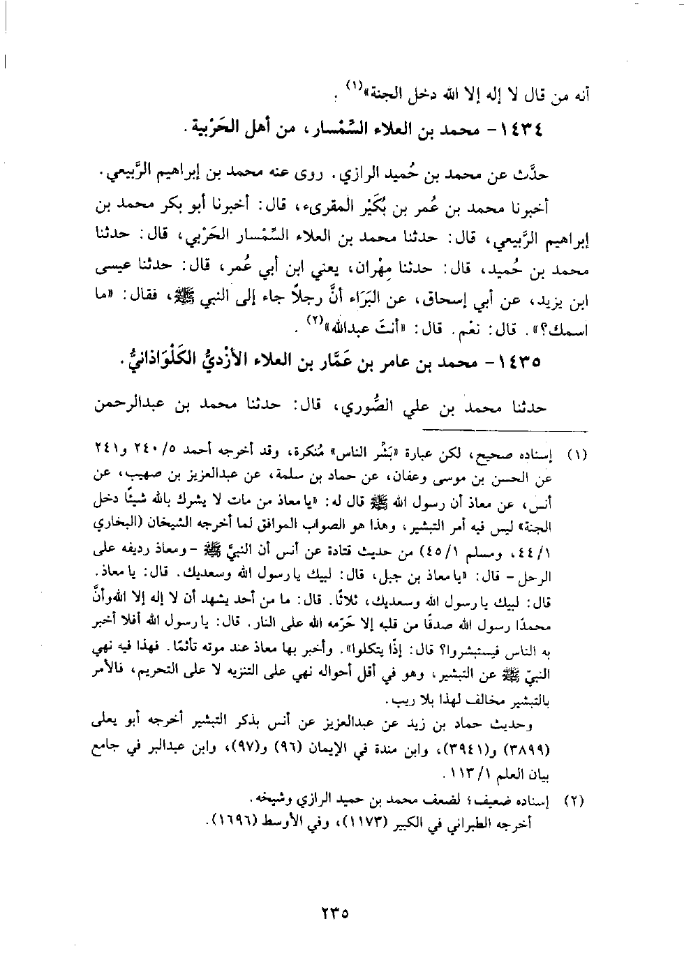 1434 - محمد بن العلاء السمسار من أهل الحربية، حدث عن محمد بن حميد الرازي.