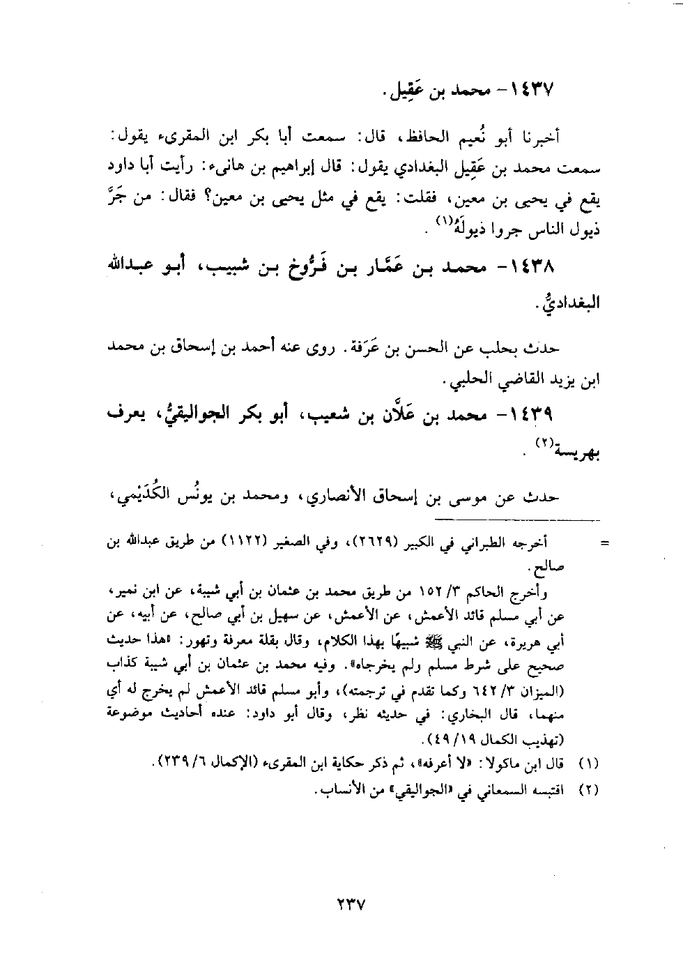1437 - محمد بن عقيل أخبرنَا أبو نعيم الحافظ، قَالَ: سمعت أبا بكر ابن المقرئ، يقول: سمعت محمد بن عقيل البغدادي، يقول: قَالَ إبراهيم بن هانئ: رأيت أبا داود يقع في يحيى بن معين، فقلت: يقع في مثل يحيى بن معين؟ فقال: من جر ذيول الناس جروا ذيوله