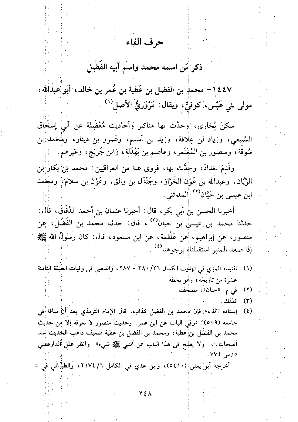 1447 - محمد بن الفضل بن عطية بن عمر بن خالد أبو عبد الله مولى بني عبس كوفي ويقال مروزي الأصل