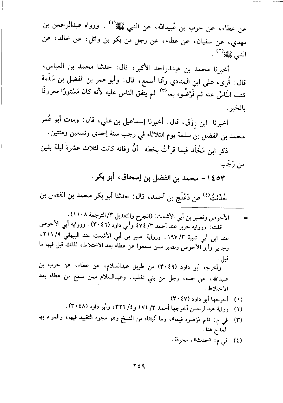 1453 - محمد بن الفضل بن إسحاق أبو بكر حدثت عن دعلج بن أحمد، قَالَ: حدثنا أبو بكر محمد بن الفضل بن إسحاق البغدادي، قَالَ: حَدَّثَنَا أبو موسى محمد بن المثنى، قَالَ: حَدَّثَنَا موسى بن مسعود، قَالَ: حَدَّثَنَا سفيان، عن الأعرج، عن وهب بن مُنَبَّه، قَالَ: في حكمة عن آل داود: حق على العاقل أن لا يشتغل عن أربع ساعات: ساعة يناجي فيها ربه، وساعة يحاسب فيها نفسه، وساعة يفضي فيها إلى إخوانه الذين يخبرونه بعيوبه ويصدقونه عن نفسه، وساعة يخلو بين نفسه وبين لذتها فيما يحل ويجمل، فإن هذه الساعة عون على تلك الساعات.