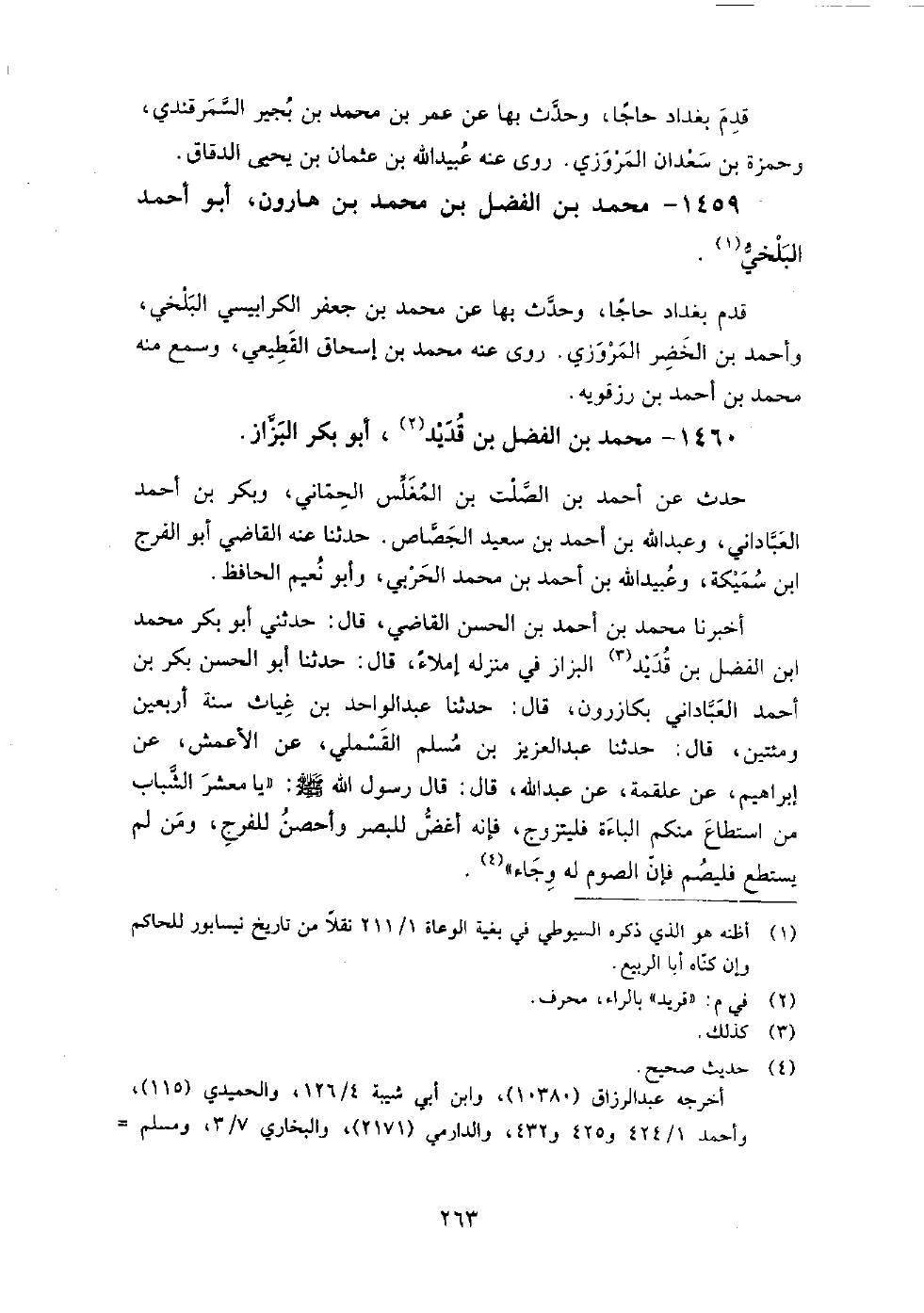 (969) -[4: 263] أخبرنا مُحَمَّدُ بْنُ أَحْمَدَ بْنِ الْحَسَنِ الْقَاضِي، قَالَ: حَدَّثَنِي أَبُو بَكْرٍ مُحَمَّدُ بْنُ الْفَضْلِ بْنِ قُدَيْدٍ الْبَزَّازُ فِي مَنْزِلِهِ إِمْلاءً، قَالَ: حدثنا أَبُو الْحَسَنِ بَكْرُ بْنُ أَحْمَدَ الْعَبَّادَانِيُّ بِكَازَرُونَ، قَالَ: حَدَّثَنَا عَبْدُ الْوَاحِدِ بْنُ غَيَّاثٍ، سَنَةَ أَرْبَعِينَ وَمِائَتَيْنِ، قَالَ: حَدَّثَنَا عَبْدُ الْعَزِيزِ بْنُ مُسْلِمٍ الْقَسْمَلِيُّ، عَنِ الأَعْمَشِ، عَنْ إِبْرَاهِيمَ، عَنْ عَلْقَمَةَ، عَنْ عَبْدِ اللَّهِ، قَالَ: قَالَ رَسُولُ اللَّهِ صَلَّى اللَّهُ عَلَيْهِ وَسَلَّمَ: " يَا مَعْشَرَ الشَّبَابِ مَنِ اسْتَطَاعَ مِنْكُمُ الْبَاءَةَ فَلْيَتَزَوَّجْ، فَإِنَّهُ أَغَضُّ لِلْبَصَرِ وَأَحْصَنُ لِلْفَرْجِ، وَمَنْ لَمْ يَسْتَطِعْ فَلْيَصُمْ فَإِنَّ الصَّوْمَ لَهُ وِجَاءٌ " أخبرنا أبو نعيم الحافظ، قَالَ: حَدَّثَنَا أبو بكر محمد بن الفضل بن قديد البغدادي بها، قَالَ: حَدَّثَنَا أحمد بن الصلت، قَالَ: سمعت بشر بن الحارث، يقول: من أراد أن يكون عزيزا في الدنيا سليما في الآخرة، فلا يحدث، ولا يشهد، ولا يؤم قوما، ولا يأكل لأحد طعاما