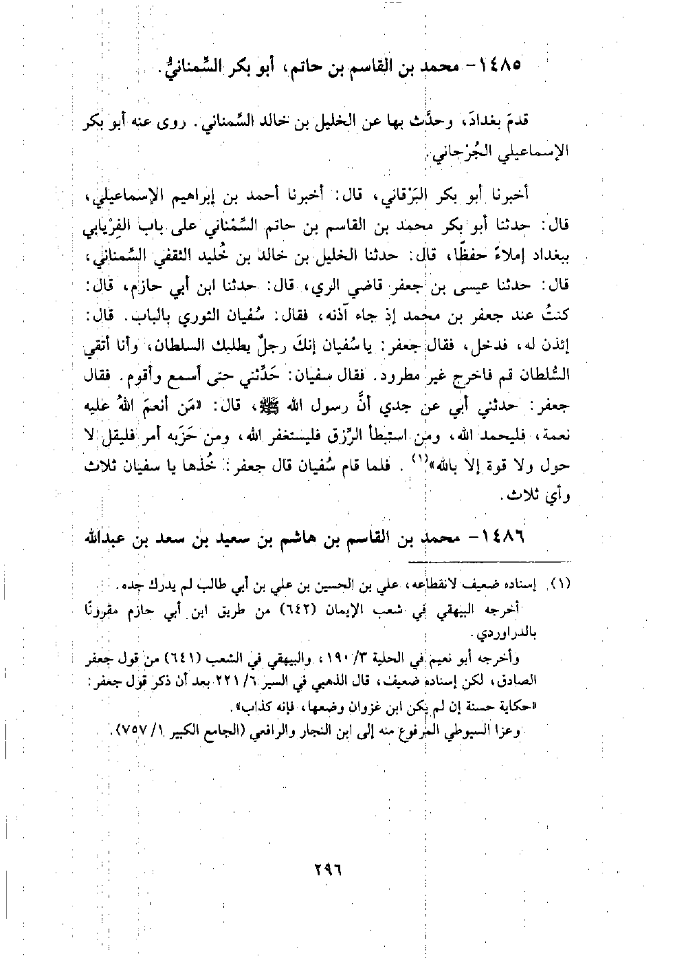 (986) -[4: 296] أخبرنا أَبُو بَكْرٍ الْبَرْقَانِيُّ، قَالَ: أخبرنا أَحْمَدُ بْنُ إِبْرَاهِيمَ الإِسْمَاعِيلِيُّ، قَالَ: حدثنا أَبُو بَكْرٍ مُحَمَّدُ بْنُ الْقَاسِمِ بْنِ حَاتِمٍ السِّمْنَانِيُّ عَلَى بَابِ الْفِرْيَابِيِّ بِبَغْدَادَ إِمْلاءً حِفْظًا، قَالَ: حَدَّثَنَا الْخَلِيلُ بْنُ خَالِدِ بْنِ خُلَيْدٍ الثَّقَفِيُّ السِّمْنَانِيُّ، قَالَ: حَدَّثَنَا عِيسَى بْنُ جَعْفَرٍ قَاضِي الرَّيِّ، قَالَ: حَدَّثَنَا ابْنُ أَبِي حَازِمٍ، قَالَ: كُنْتُ عِنْدَ جَعْفَرِ بْنِ مُحَمَّدٍ إِذْ جَاءَ آذِنُهُ، فَقَالَ: سُفْيَانَ الثَّوْرِيِّ بِالْبَابِ.