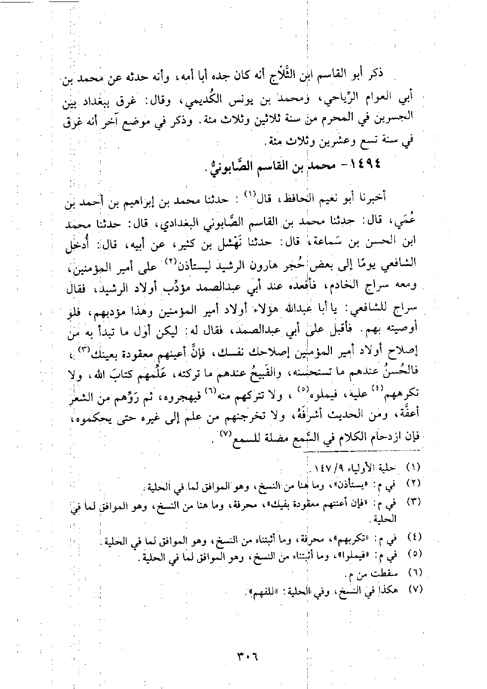 1494 - محمد بن القاسم الصابوني أخبرنا أبو نعيم الحافظ، قَالَ: حَدَّثَنَا محمد بن إبراهيم بن أحمد بن عمي، قَالَ: حَدَّثَنَا محمد بن القاسم الصابوني البغدادي، قَالَ: حَدَّثَنَا محمد بن الحسن بن سماعه، قَالَ: حَدَّثَنَا نهشل بن كثير، عن أبيه، قَالَ: أدخل الشافعي يوما إلى بعض حجر هارون الرشيد ليستأذن على أمير المؤمنين، ومعه سراج الخادم، فأقعده عند أبي عبد الصمد مؤدب أولاد الرشيد، فقال سراج للشافعي: يا أبا عبد الله هؤلاء أولاد أمير المؤمنين وهذا مؤدبهم، فلو أوصيته بهم.