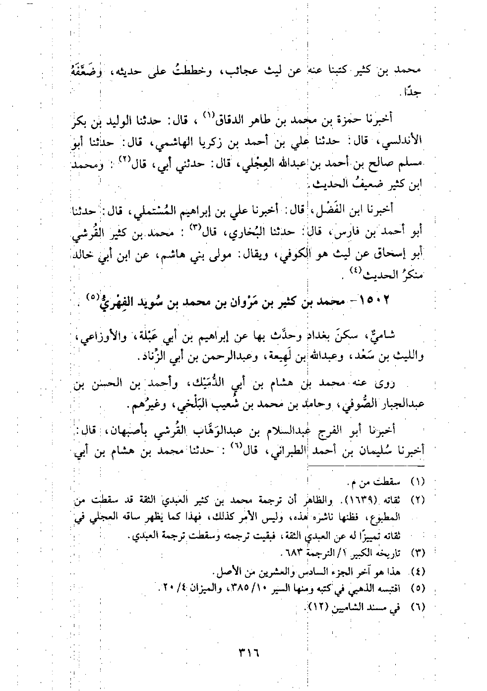 1502 - محمد بن كثير بن مروان بن محمد بن سويد الفهري شامي، سكن بغداد وحدث بها عن إبراهيم بن أبي عبلة، والأوزاعي، والليث بن سعد، وعبد الله بن لهيعة، وعبد الرحمن بن أبي الزناد.