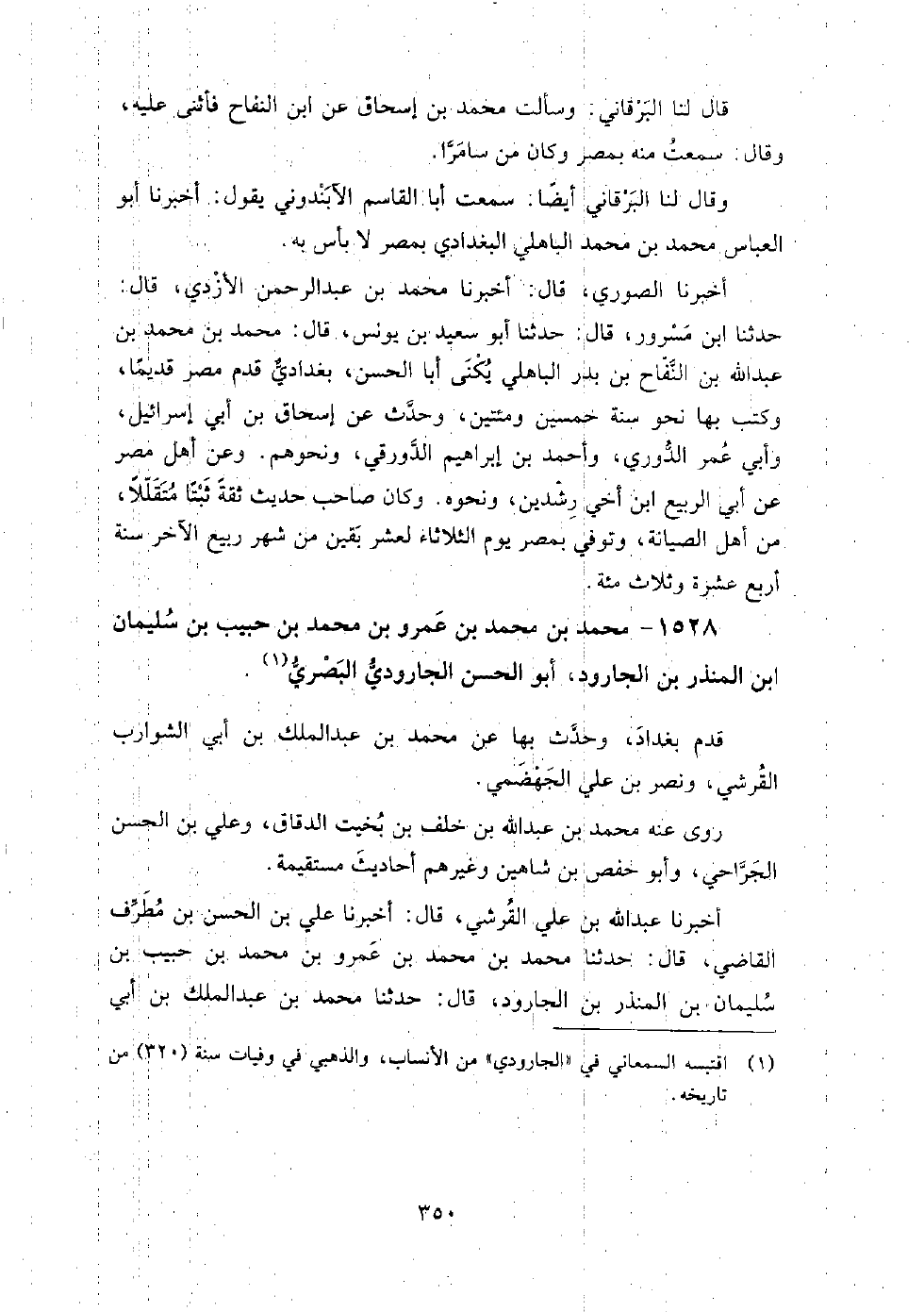 1528 - محمد بن محمد بن عمرو بن محمد بن حبيب بن سليمان بن المنذر بن الجارود أبو الحسن الجارودي البصري قدم بغداد، وحدث بها عن محمد بن عبد الملك بن أبي الشوارب القرشي، ونصر بن علي الجهضمي.
