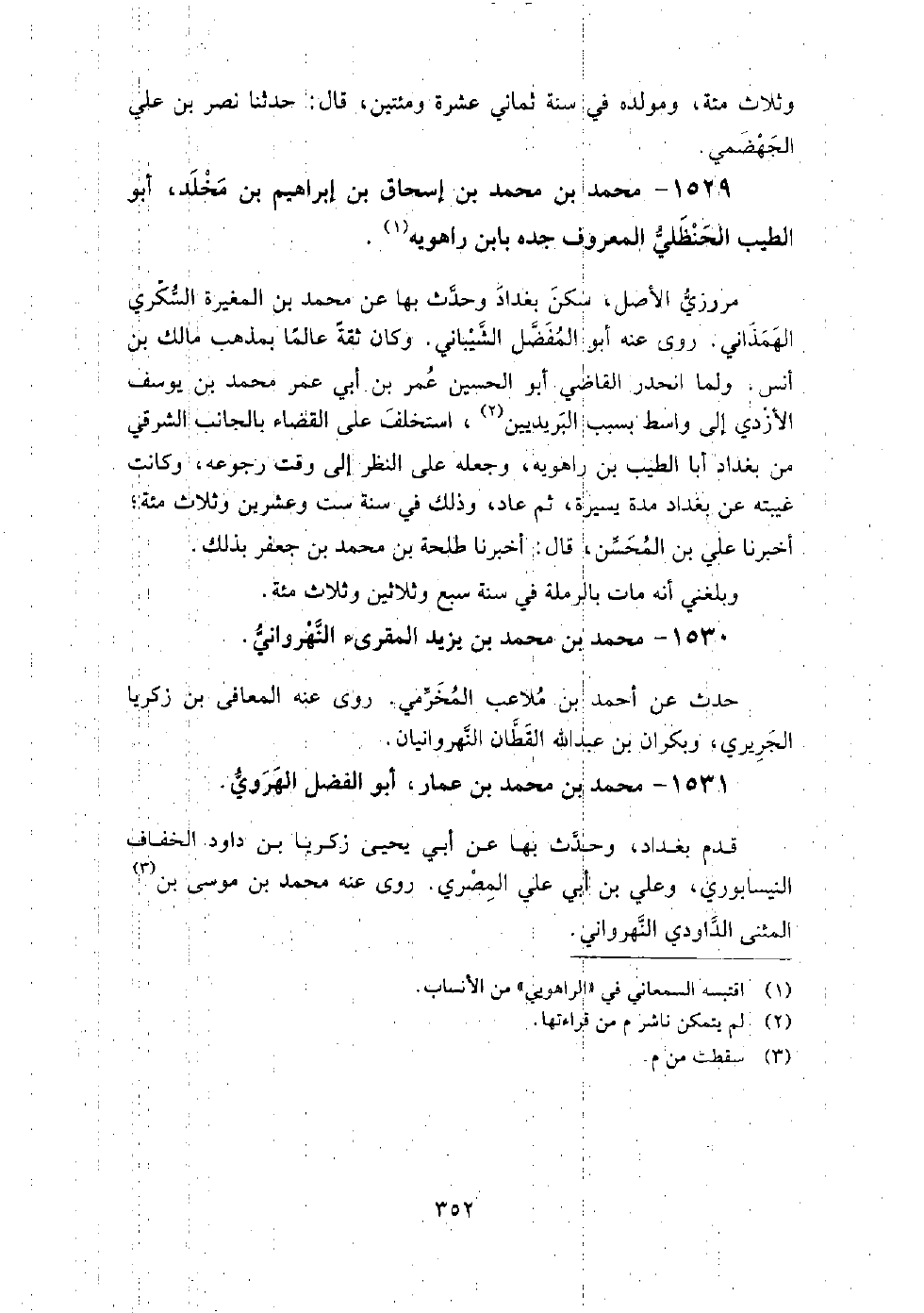 1529 - محمد بن محمد بن إسحاق بن إبراهيم بن مخلد أبو الطيب الحنظلي المعروف جده بابن راهويه مروزي الأصل، سكن بغداد وحدث بها عن محمد بن المغيرة السكري الهمذاني.