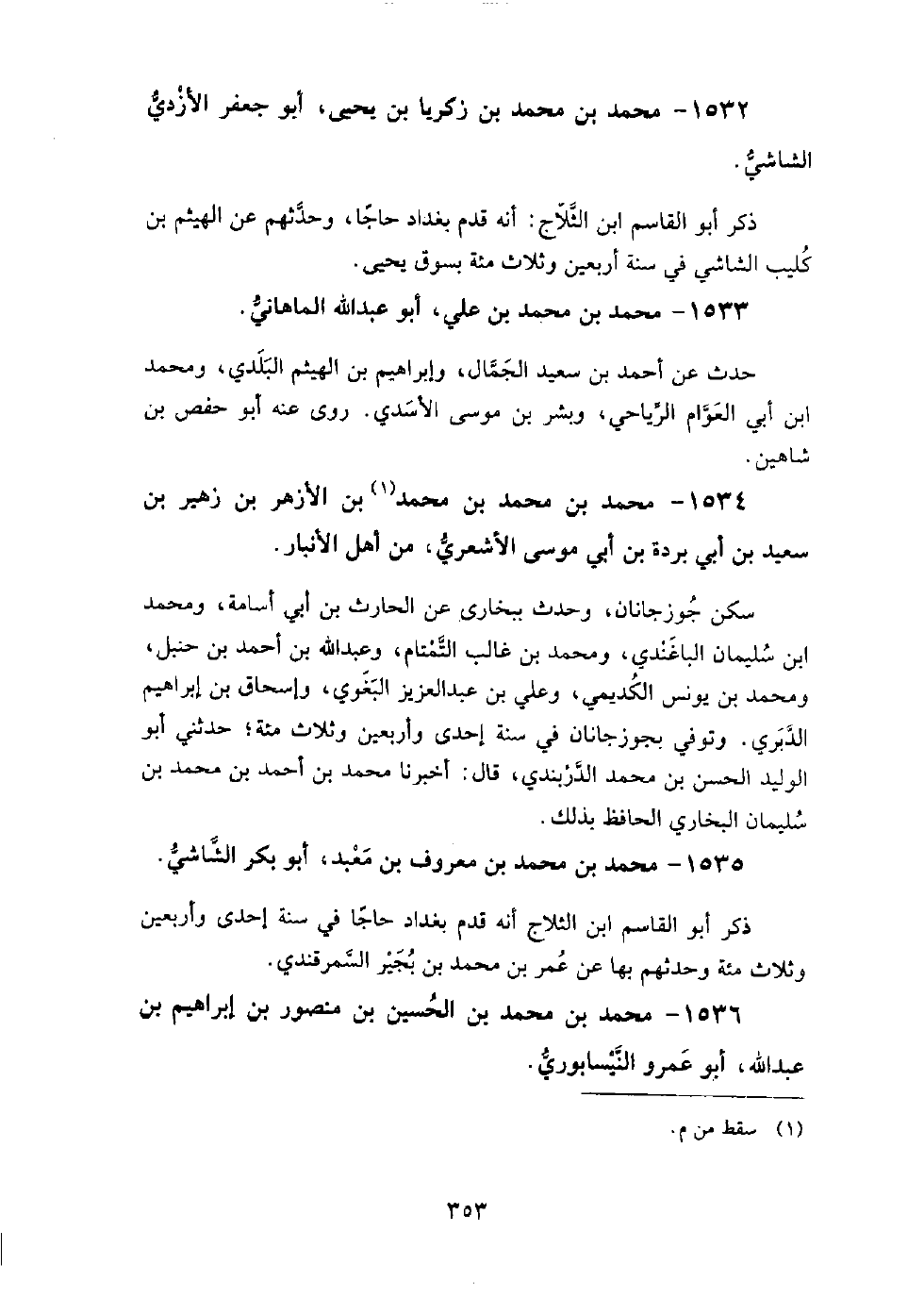 1534 - محمد بن محمد بن محمد بن الأزهر بن زهير بن سعيد بن أبي بردة بن أبي موسى الأشعري من أهل الأنبار، سكن جوزجانان، وحدث ببخارى عن الحارث بن أبي أسامة، ومحمد بن سليمان الباغندي، ومحمد بن غالب التمتام، وعبد الله بن أحمد بن حنبل، ومحمد بن يونس الكديمي، وعلي بن عبد العزيز البغوي، وإسحاق بن إبراهيم الدبري.