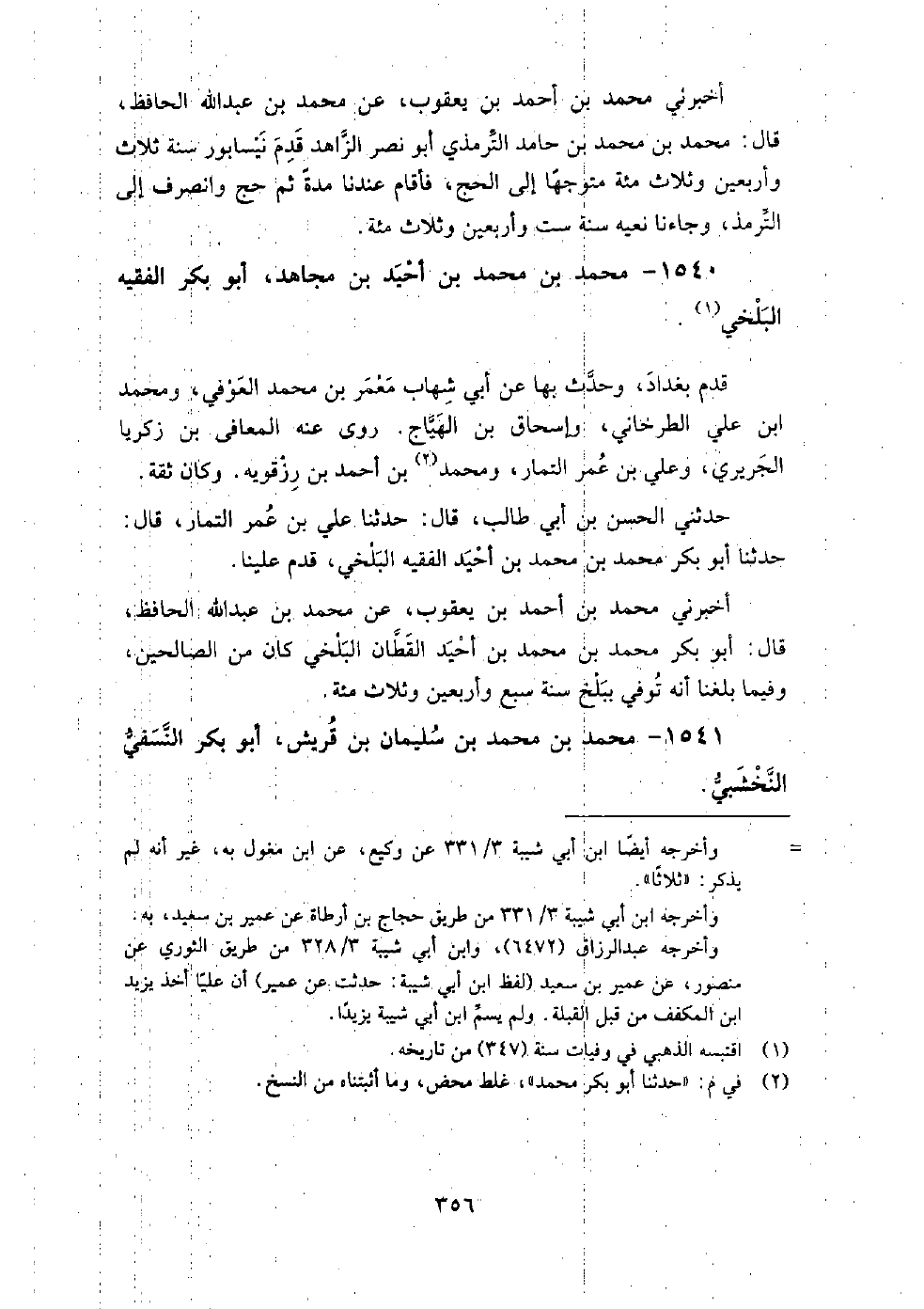 1541 - محمد بن محمد بن سليمان بن قريش أبو بكر النسفي النخشبي قدم بغداد، وحدث بها عن: أبي حامد أحمد بن العباس الكسي، وصالح بن أبي رميح الترمذي، وعبد الله بن نصر القرقوبي النخشبي.