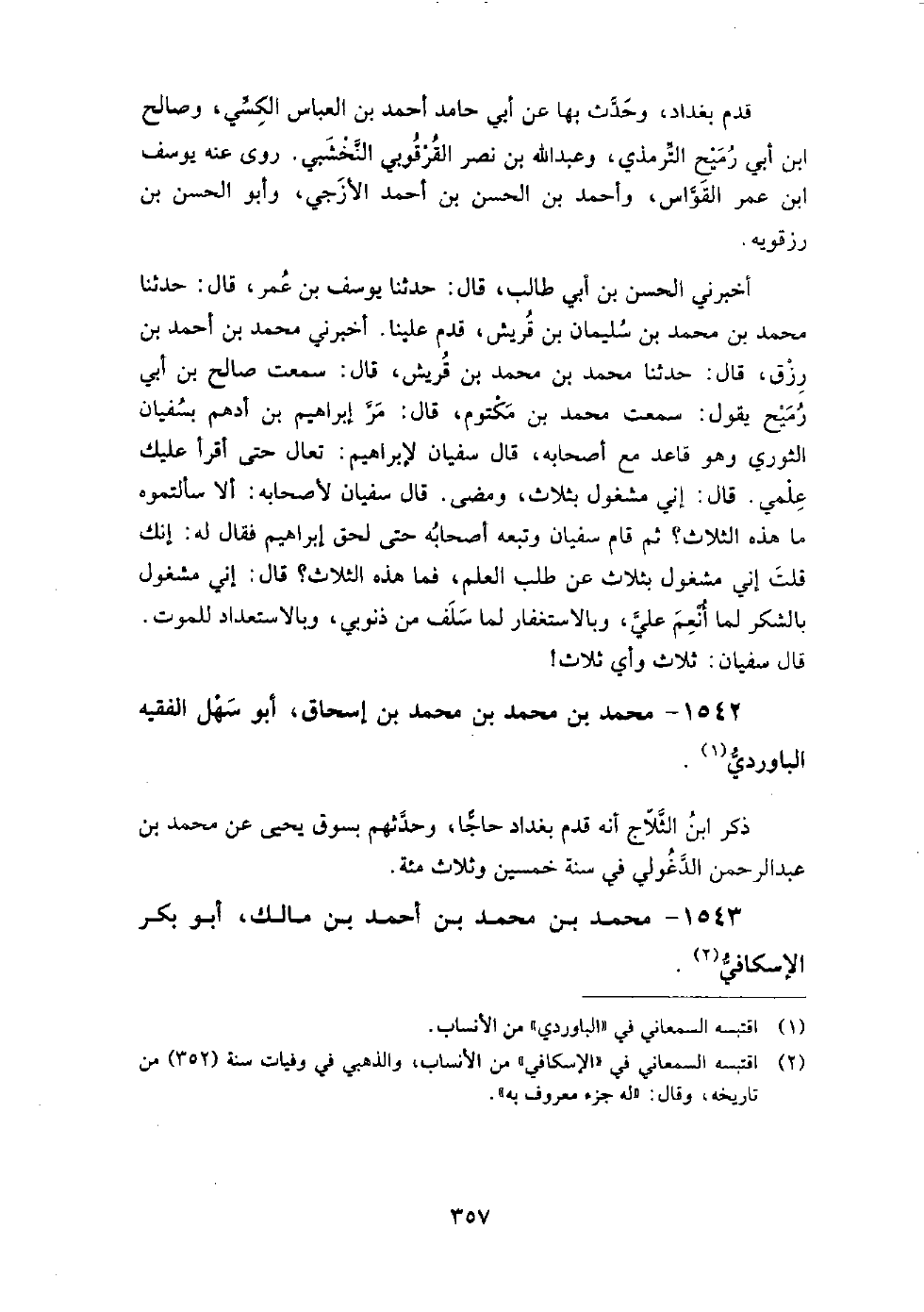 1542 - محمد بن محمد بن محمد بن إسحاق أبو سهل الفقيه الباوردي ذكر أبن الثلاج أنه قدم بغداد حاجا، وحدثهم بسوق يحيى، عن محمد بن عبد الرحمن الدغولي في سنة خمس وثلاث مائة.