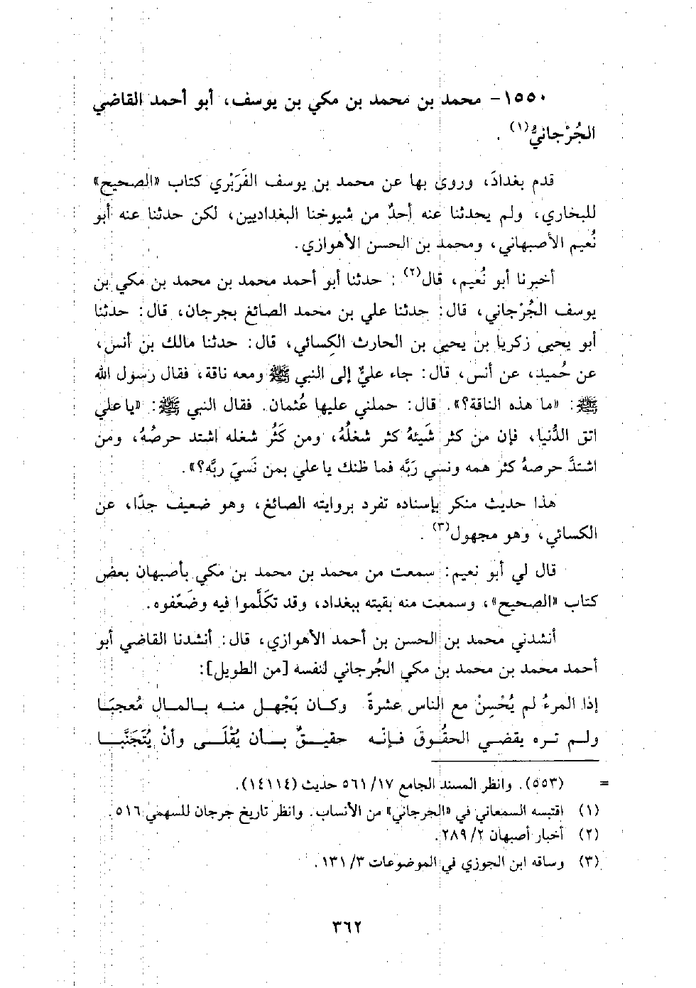 1550 - محمد بن محمد بن مكي بن يوسف أبو أحمد القاضي الجرجاني قدم بغداد، وروى بها عن محمد بن يوسف الفربري كتاب الصحيح للبخاري، ولم يحدثنا عنه أحد من شيوخنا البغداديين، لكن حَدَّثَنَا عنه أبو نعيم الأصبهاني، ومحمد بن الحسن الأهوازي.