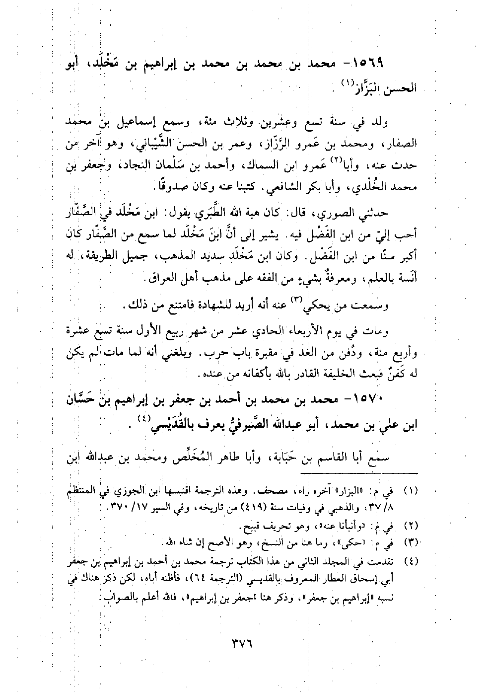 1570 - محمد بن محمد بن أحمد بن جعفر بن إبراهيم بن حسان بن علي بن محمد أبو عبد الله الصيرفي يعرف بالقديسي سمع أبا القاسم بن حبابة، وأبا طاهر المُخَلِّصُ ومحمد بن عبد الله ابن أخي ميمي، وعبيد الله بن عثمان بن يحيى الدقاق، وعبد الله بن محمد بن قيس البزاز.