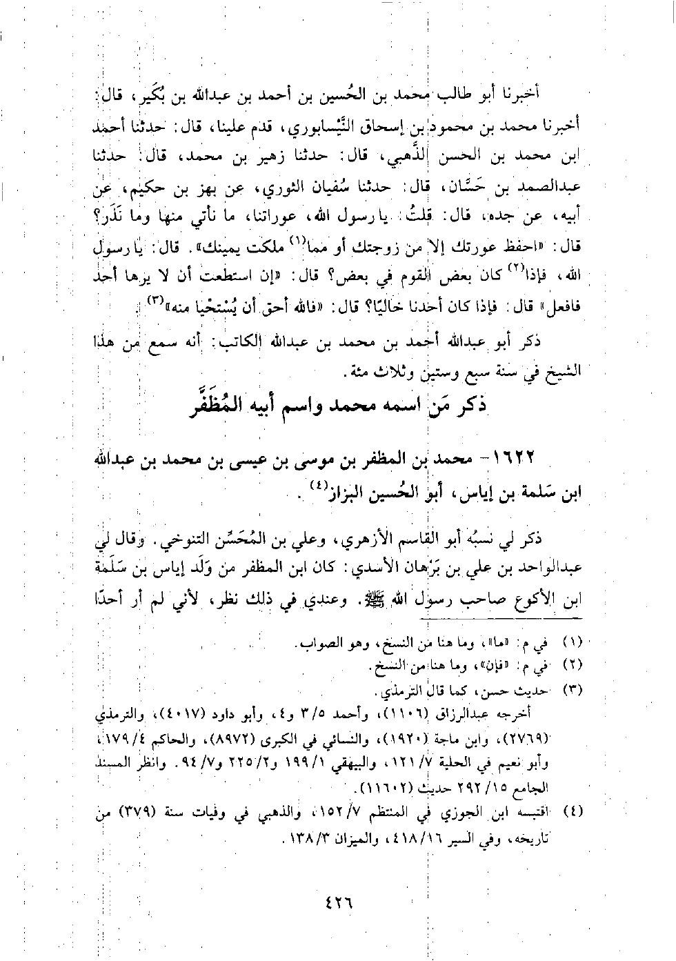 1622 - محمد بن المظفر بن موسى بن عيسى بن محمد بن عبد الله بن سلمة بن إياس أبو الحسين البزاز ذكر لي نسبه أبو القاسم الأزهري، وعلي بن المحسن التنوخي، وَقَالَ لي عبد الواحد بن علي بن برهان الأسدي: كان ابن المظفر من ولد إياس بن سلمة بن الأكوع صاحب رسول الله صَلَّى اللَّهُ عَلَيْهِ وَسَلَّمَ في ذلك نظر، لأني لم أر أحدا ذكره غير بن برهان.
