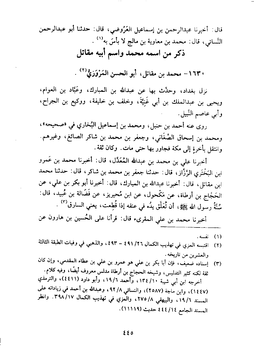 (1076) -[4: 445] أخبرنا عَلِيُّ بْنُ مُحَمَّدِ بْنِ عَبْدِ اللَّهِ الْمُعَدَّلُ قَالَ: أخبرنا مُحَمَّدُ بْنُ عَمْرِو بْنِ الْبَخْتَرِيِّ الرَّزَّازُ، قَالَ: حَدَّثَنَا جَعْفَرُ بْنُ مُحَمَّدِ بْنِ شَاكِرٍ، قَالَ: حَدَّثَنَا مُحَمَّدُ بْنُ مُقَاتِلٍ، قَالَ: أخبرنا عَبْدُ اللَّهِ بْنُ الْمُبَارَكِ، قَالَ: أخبرنا أَبُو بَكْرِ بْنُ عَلِيٍّ، عَنِ الْحَجَّاجِ بْنِ أَرْطَاةَ، عَنْ مَكْحُولٍ، عَنِ ابْنِ مُحَيْرِيزٍ، عَنْ فَضَالَةَ بْنِ عُبَيْدٍ، قَالَ: سُنَّةُ رَسُولِ اللَّهِ صَلَّى اللَّهُ عَلَيْهِ وَسَلَّمَ أَنْ تُعَلَّقَ يَدُهُ فِي عُنُقِهِ إِذَا قُطِعَتْ، يَعْنِي السَّارِقَ أخبرنا محمد بن علي المقرئ، قَالَ: قرأنا على الحسين بن هارون، عن ابن سعيد، قَالَ: محمد بن مقاتل المروزي نزل بغداد أخبرنا ابن الفضل، قَالَ: حَدَّثَنَا علي بن إبراهيم، قَالَ: حَدَّثَنَا ابن فارس، قَالَ: حَدَّثَنَا البخاري، قَالَ: محمد بن مقاتل أبو الحسن المروزي مات سنة ست وعشرين ومائتين، في آخرها