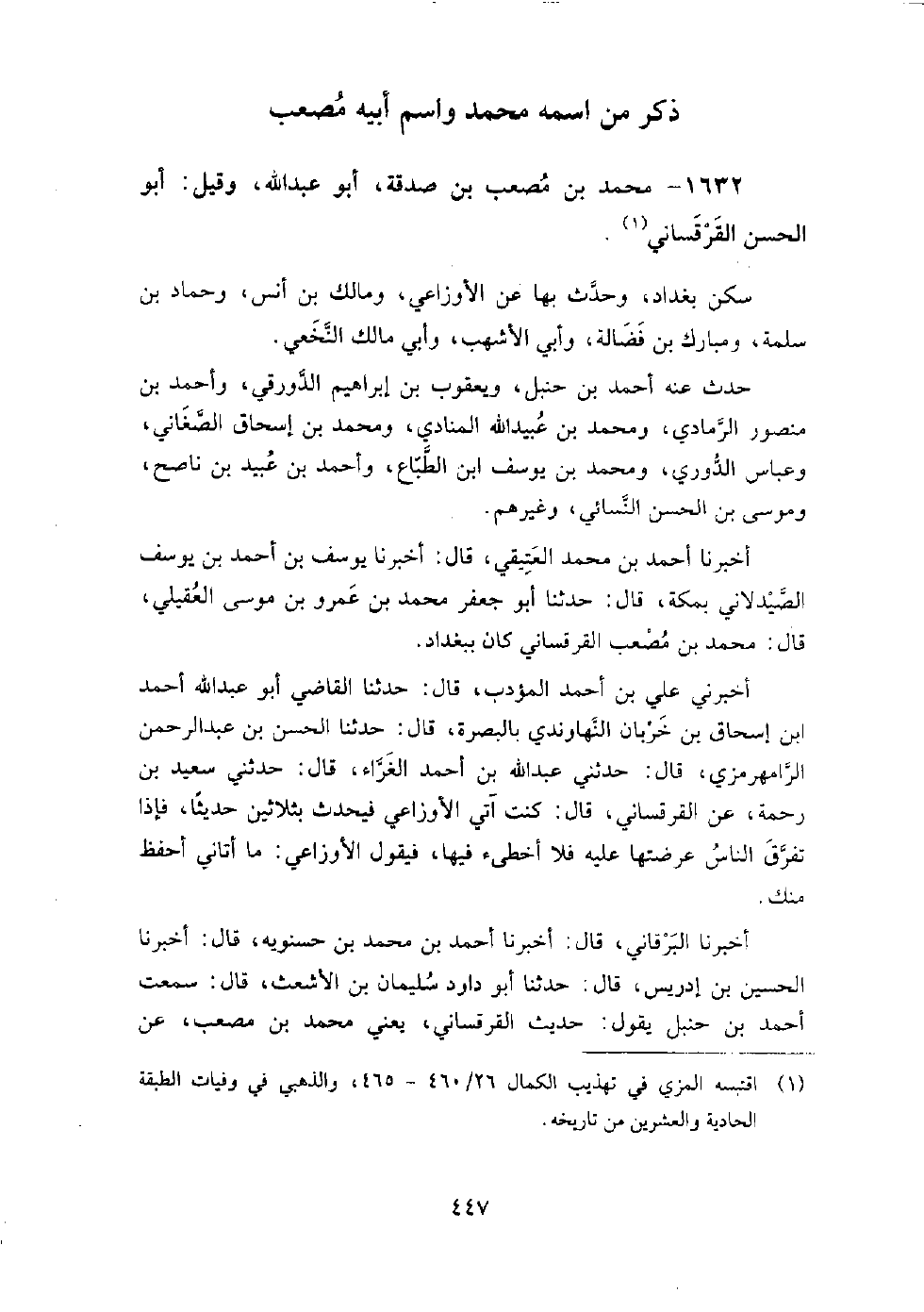 1632 - محمد بن مصعب بن صدقة أبو عبد الله وقيل أبو الحسن القرقساني سكن بغداد، وحدث بها عن الأوزاعي، ومالك بن أنس، وحماد بن سلمة، ومبارك بن فضالة، وأبي الأشهب، وأبي الأشهب، وأبي مالك النخعي.