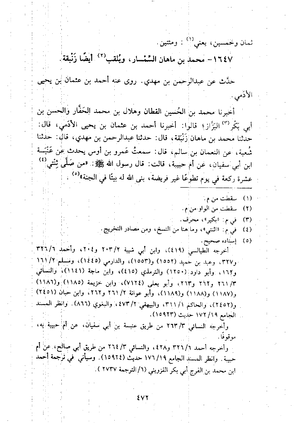 1647 - محمد بن ماهان السمسار ويلقب أيضا زنبقة حدث عن: عبد الرحمن بن مهدي.
