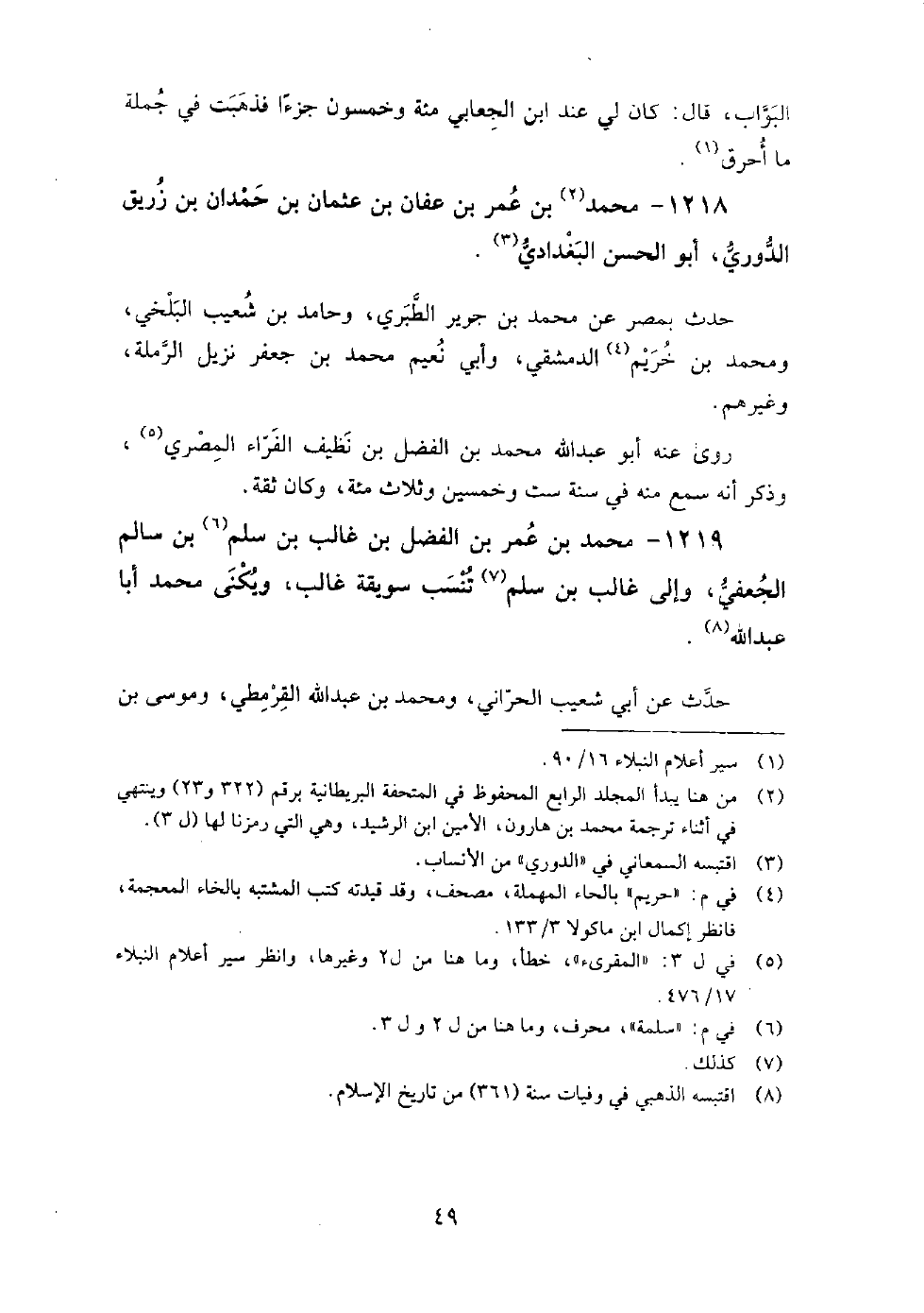 1218 - محمد بن عمر بن عفان بن عثمان بن حمدان بن زريق الدوري أبو الحسن البغدادي حدث بمصر عن: محمد بن جرير الطبري، وحامد بن شعيب البلخي، ومحمد بن خريم الدمشقي، وأبي نعيم محمد بن جعفر، نزيل الرملة، وغيرهم.