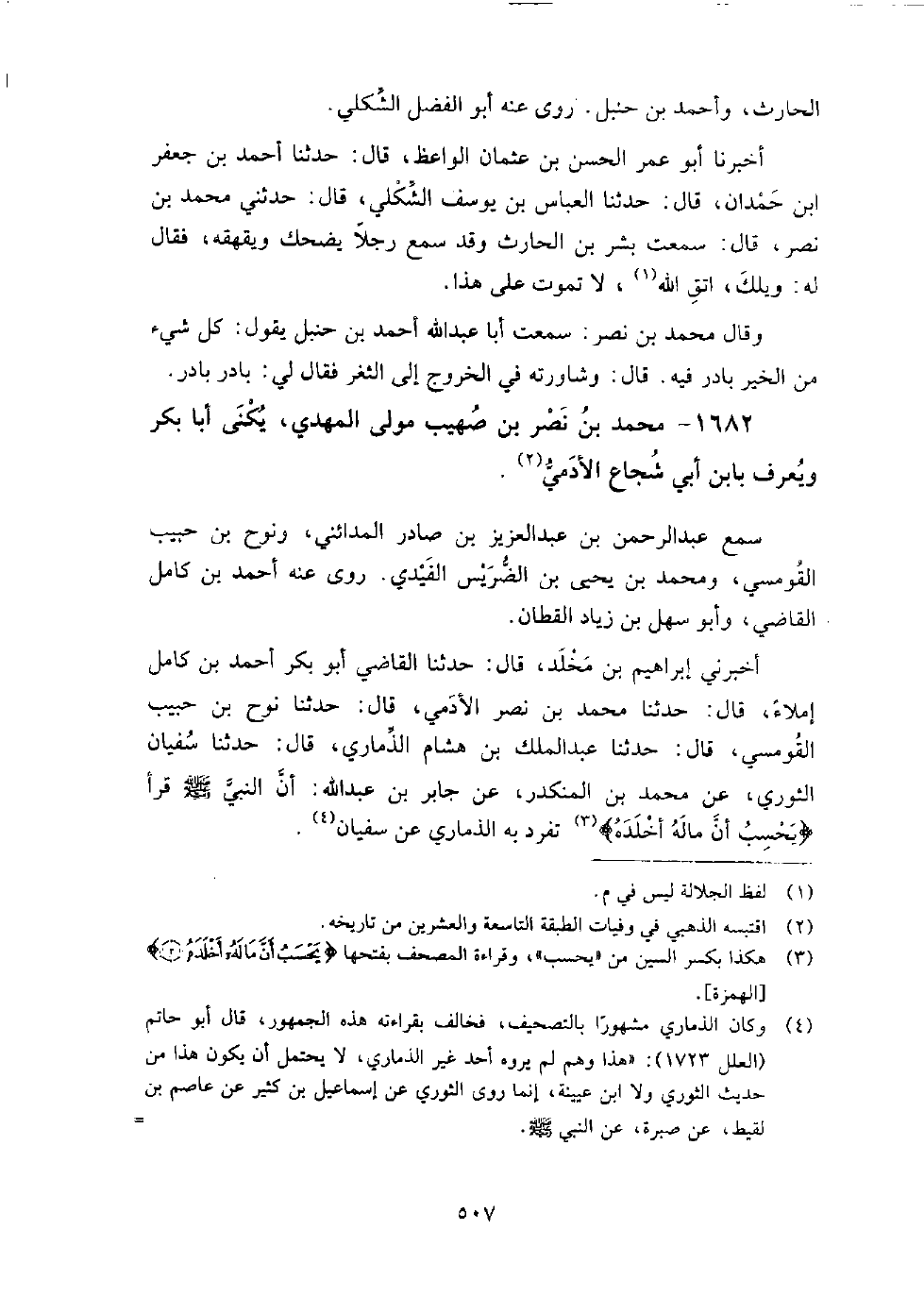 (1120) -[4: 507] أَخْبَرَنِي إِبْرَاهِيمُ بْنُ مَخْلَدٍ، قَالَ: حَدَّثَنَا الْقَاضِي أَبُو بَكْرٍ أَحْمَدُ بْنُ كَامِلٍ إِمْلاءً، قَالَ: حَدَّثَنَا مُحَمَّدُ بْنُ نَصْرٍ الأَدَمِيُّ، قَالَ: حَدَّثَنَا نُوحُ بْنُ حَبِيبٍ الْقَوْمَسِيُّ، قَالَ: حَدَّثَنَا عَبْدُ الْمَلِكِ بْنُ هِشَامٍ الذِّمَارِيُّ، قَالَ: حَدَّثَنَا سُفْيَانُ الثَّوْرِيُّ، عَنْ مُحَمَّدِ بْنِ الْمُنْكَدِرِ، عَنْ جَابِرِ بْنِ عَبْدِ اللَّهِ: أَنَّ النَّبِيَّ صَلَّى اللَّهُ عَلَيْهِ وَسَلَّمَ قَرَأ َ {يَحْسَبُ أَنَّ مَالَهُ أَخْلَدَهُ}.