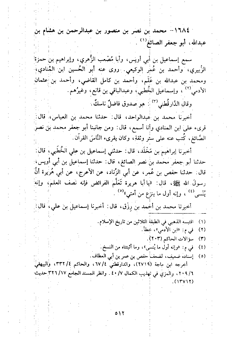 1684 - محمد بن نصر بن منصور بن عبد الرحمن بن هشام بن عبد الله أبو جعفر الصائغ سمع إسماعيل بن أبي أويس، وأبا مصعب الزهري، وإبراهيم بن حمزة الزبيري، وأحمد بن عمر الوكيعي.