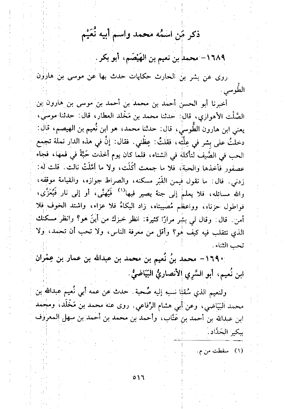 1689 - محمد بن نعيم بن الهيصم أبو بكر روى عن: بشر بن الحارث حكايات حدث بها عنه موسى بن هارون الطوسي أخبرنا أبو الحسن أحمد بن محمد بن أحمد بن موسى بن هارون بن الصلت الأهوازي، قَالَ: حَدَّثَنَا محمد بن مخلد العطار، قَالَ: حَدَّثَنَا موسى، يعني ابن هارون الطوسي، قَالَ: حَدَّثَنَا محمد هو ابن نعيم بن الهيصم، قَالَ: دخلت على بشر في علته، فقلت: عظني.