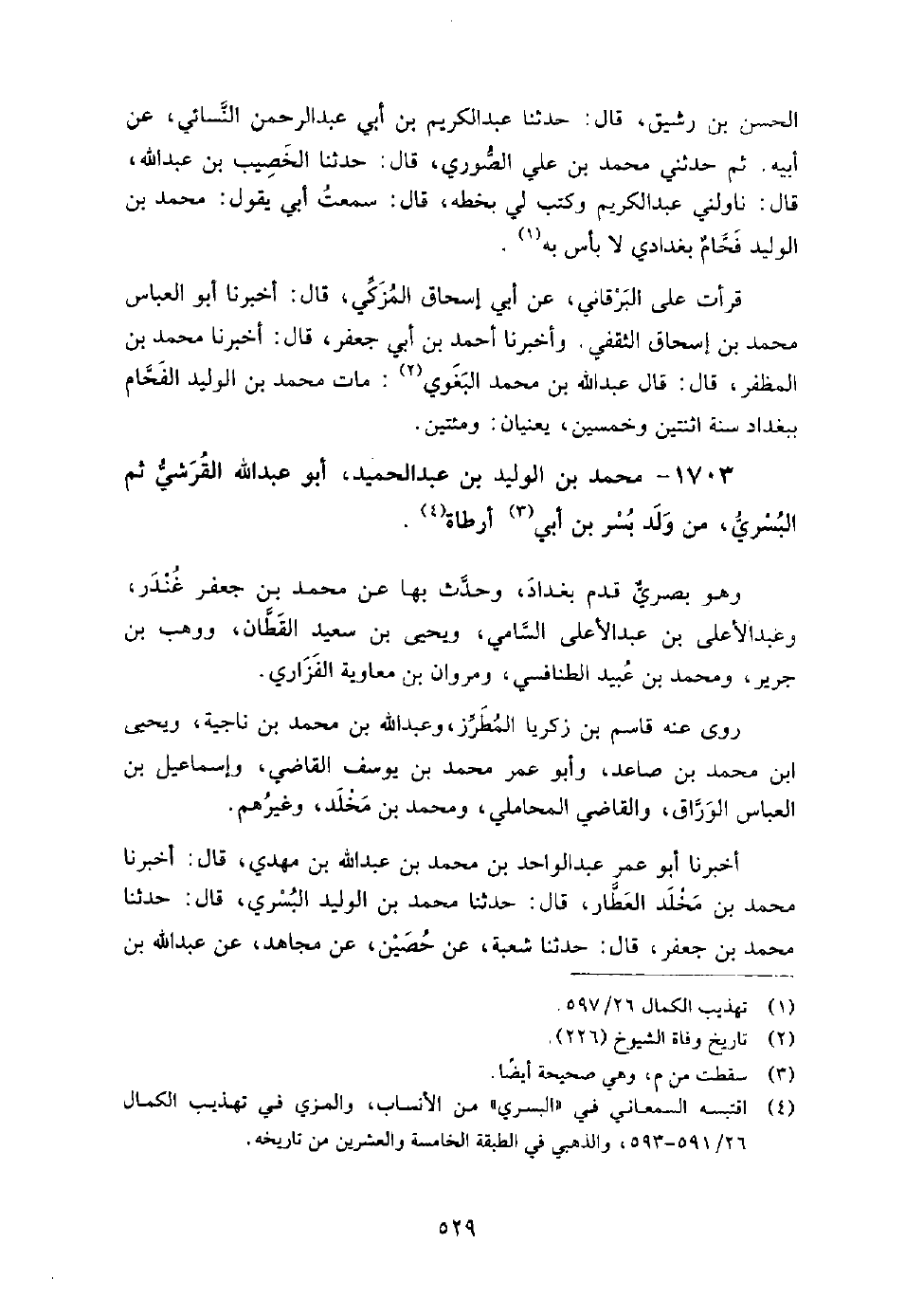 1703 - محمد بن الوليد بن عبد الحميد أبو عبد الله القرشي ثم البسري من ولد بسر بن أبي أرطاة وهو بصري قدم بغداد، وحدث بها عن محمد بن جعفر غندر، وعبد الأعلى بن عبد الأعلى السَّامي، ويحيى بن سعيد القطان، ووهب بن جرير، ومحمد بن عبيد الطنافسي، ومروان بن معاوية الفزاري.