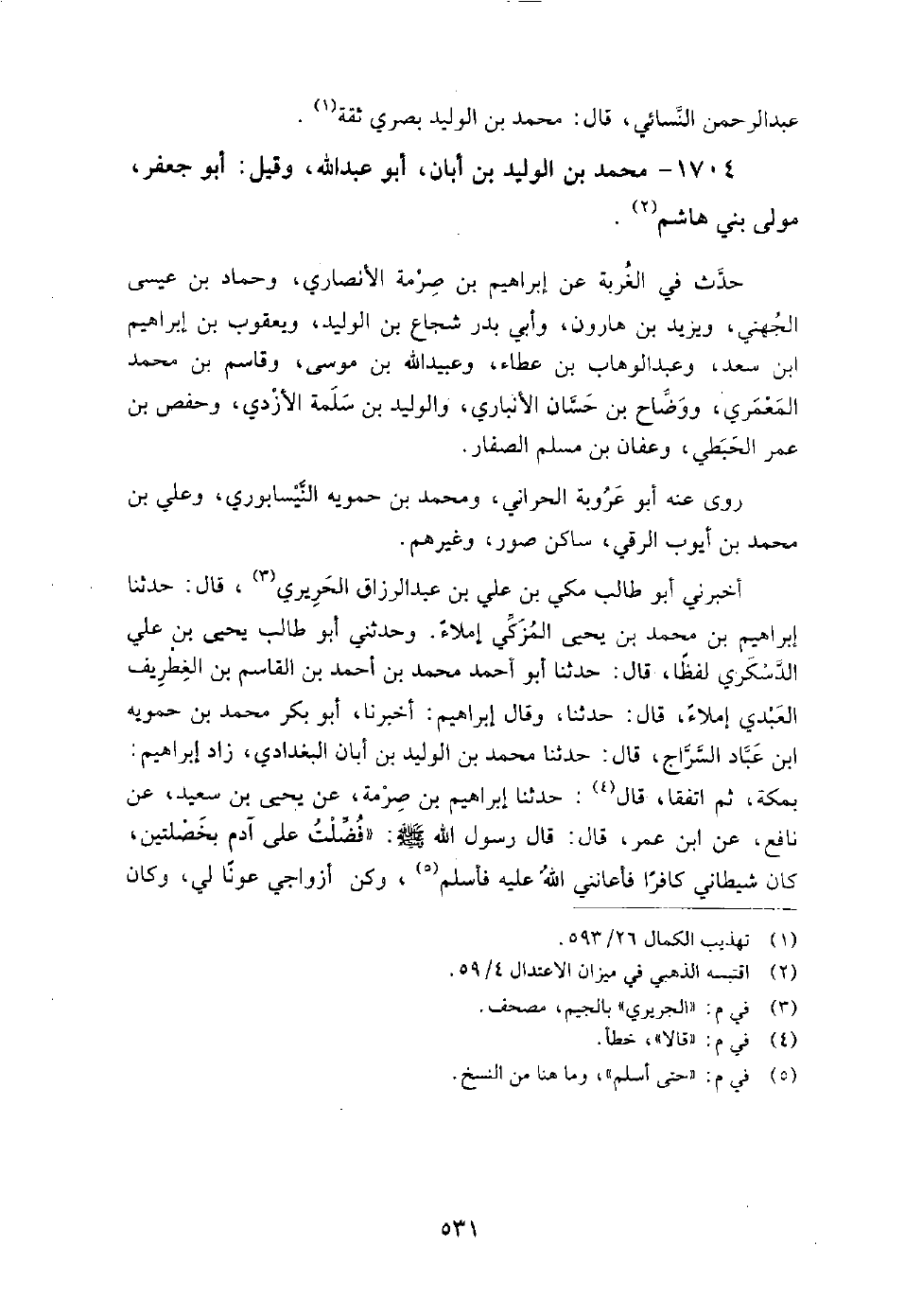 1704 - محمد بن الوليد بن أبان أبو عبد الله وقيل أبو جعفر مولى بني هاشم حدث في الغربة عن إبراهيم بن صرمة الأنصاري، وحماد بن عيسى الجهني، ويزيد بن هارون، وأبي بدر شجاع بن الوليد، ويعقوب بن إبراهيم بن سعد، وعبد الوهاب بن عطاء، وعبيد الله بن موسى، وقاسم بن محمد المعمري، ووضاح بن حسان الأنباري، والوليد بن سلمة الأزدي، وحفص بن عمر الحبطي، وعفان بن مسلم الصفار.
