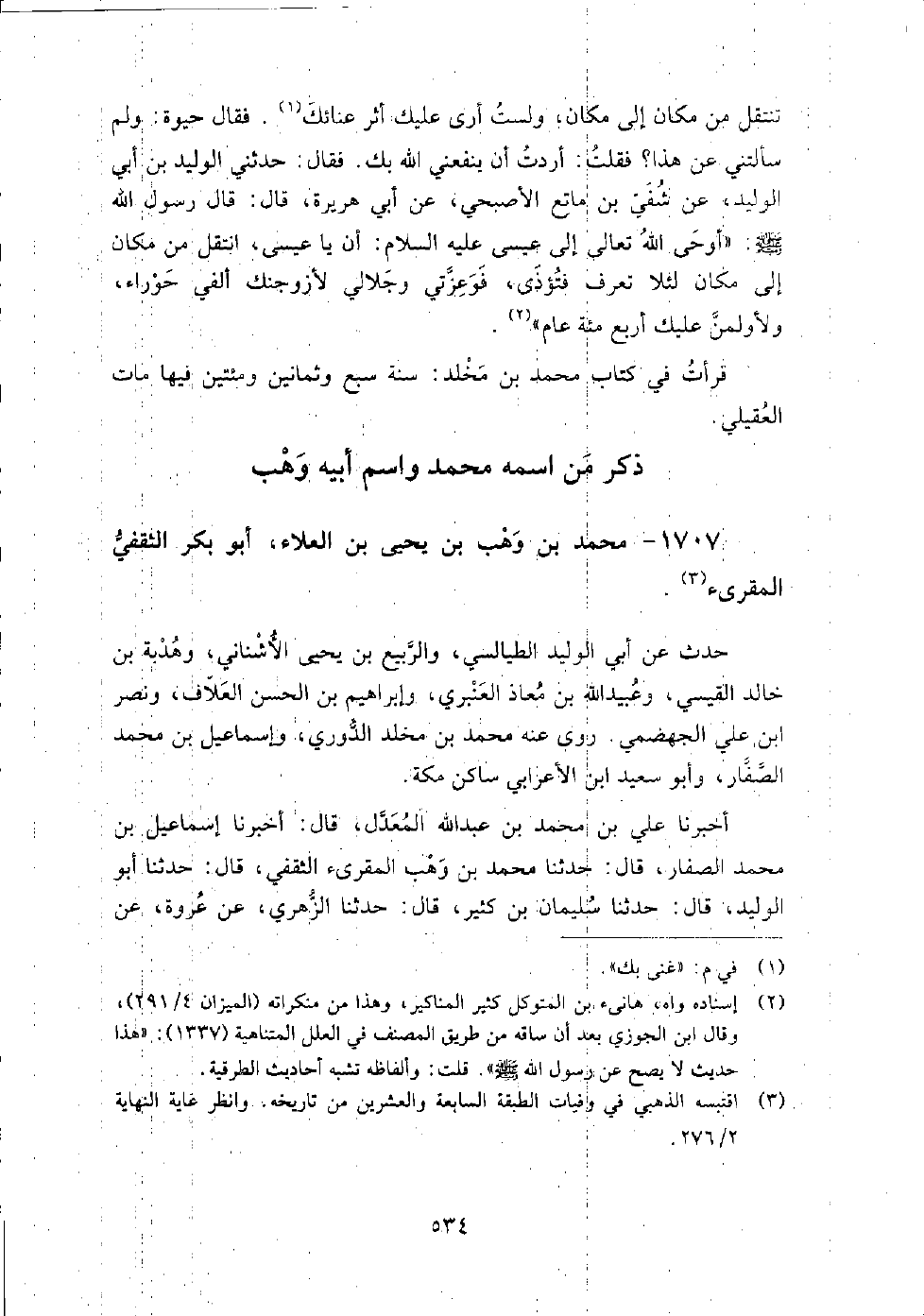 (1135) -[4: 534] أخبرنا عَلِيُّ بْنُ مُحَمَّدِ بْنِ عَبْدِ اللَّهِ الْمُعَدَّلُ، قَالَ: أخبرنا إِسْمَاعِيلُ بْنُ مُحَمَّدٍ الصَّفَّارُ، قَالَ: حَدَّثَنَا مُحَمَّدُ بْنُ وَهْبٍ الْمُقْرِئُ الثَّقَفِيُّ، قَالَ: حَدَّثَنَا أَبُو الْوَلِيدِ، قَالَ: حَدَّثَنَا سُلَيْمَانُ بْنُ كَثِيرٍ، قَالَ: حَدَّثَنَا الزُّهْرِيُّ، عَنْ عُرْوَةَ، عَنْ عَائِشَةَ، قَالَتْ: قَالَ رَسُولُ اللَّهِ صَلَّى اللَّهُ عَلَيْهِ وَسَلَّمَ: " أَوْحَى إِلَيَّ أَنَّكُمْ تُفْتَنُونَ فِي قُبُورِكُمْ " حَدَّثَنِي محمد بن أبي الحسن، قَالَ: أخبرنا عبد الرحمن بن عمر المصري، قَالَ: أخبرنا أبو سعيد أحمد بن محمد بن زياد، قَالَ: حَدَّثَنَا أبو بكر محمد بن وهب بن يحيى بن العلاء بن عبد الحكم بن عبيد بن هلال بن تميم بن جابر بن عبد الله الثقفي في مسجد رغَبان كذا في الكتاب، والصواب بن رغْبان سنة خمس وستين، يعني ومائتين، قَالَ: حَدَّثَنَا الربيع بن يحيى، قَالَ: حَدَّثَنَا مالك بن مغول عن الشعبي {فَنَبَذُوهُ وَرَاءَ ظُهُورِهِمْ} قَالَ: العمل به