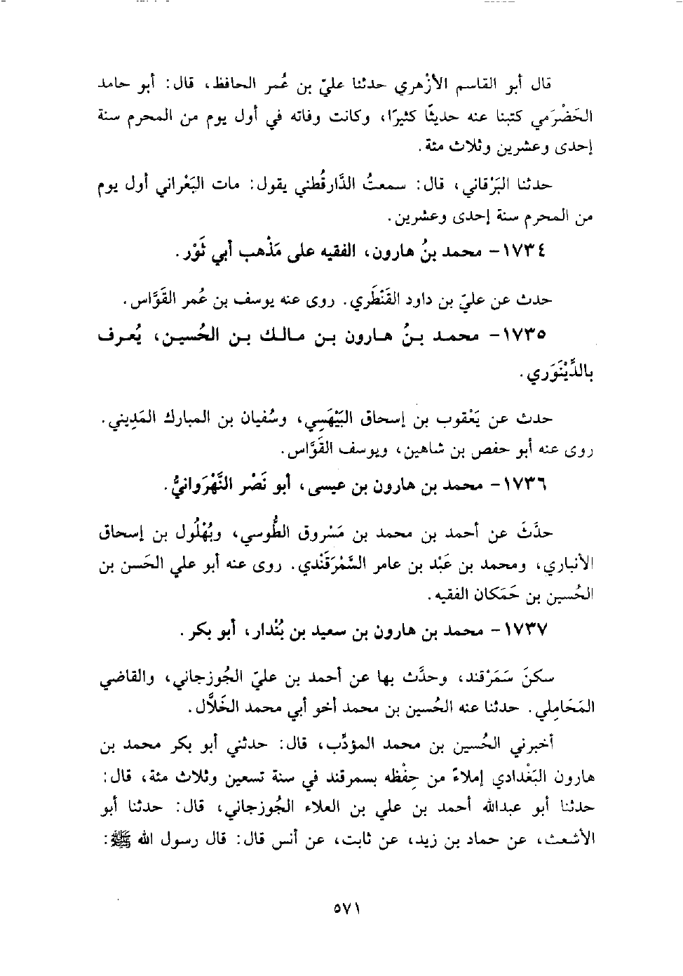 1736 - محمد بن هارون بن عيسى أبو نصر النهرواني حدث عن: أحمد بن محمد بن مسروق الطوسي، وبهلول بن إسحاق الأنباري، ومحمد بن عبد بن عامر السمرقندي.