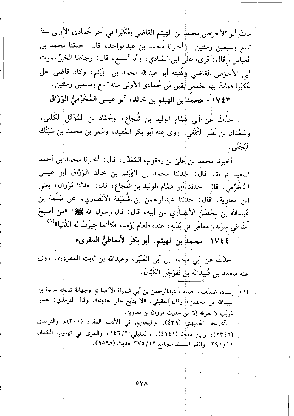 1743 - محمد بن الهيثم بن خالد أبو عيسى المخرمي الوراق حدث عن: أبي همام الوليد بن شجاع وحماد بن المؤمل الكلبي، وسعدان بن نصر الثقفي.