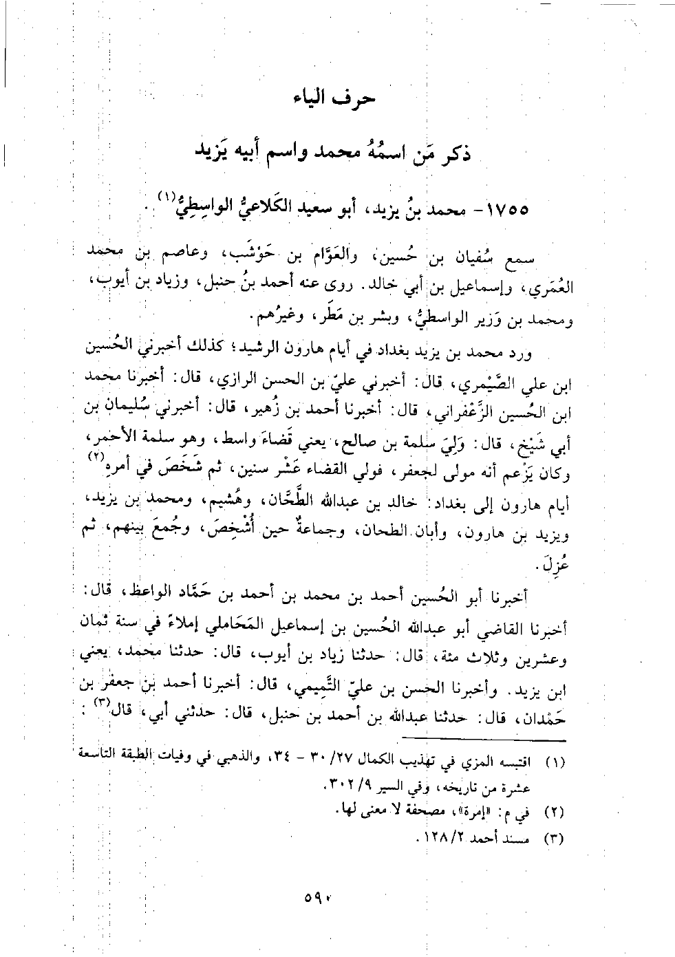 (1163) -[4: 590] أخبرنا أَبُو الْحُسَيْنِ أَحْمَدُ بْنُ مُحَمَّدِ بْنِ أَحْمَدَ بْنِ حَمَّادٍ الْوَاعِظُ، قَالَ: أخبرنا الْقَاضِي أَبُو عَبْدِ اللَّهِ الْحُسَيْنُ بْنُ إِسْمَاعِيلَ الْمَحَامِلِيُّ، إِمْلاءً فِي سَنَةِ ثَمَانٍ وَعِشْرِينَ وَثَلاثِ مِائَةٍ، قَالَ: حَدَّثَنَا زِيَادُ بْنُ أَيُّوبَ، قَالَ: حَدَّثَنَا مُحَمَّدُ يَعْنِي ابْنَ يَزِيدَ.