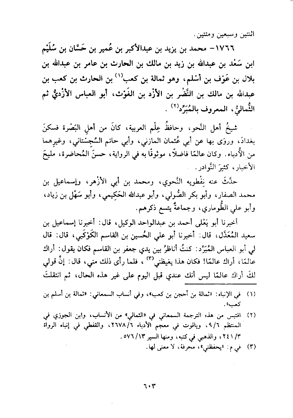 1766 - محمد بن يزيد بن عبد الأكبر بن عمير بن حسان بن سليم بن سعد بن عبد الله بن زيد بن مالك بن الحارث بن عامر بن عبد الله بن بلال بن عوف بن أسلم وهو ثماله بن كعب بن الحارث بن كعب بن عبد الله بن مالك بن النضر بن الأزد بن الغوث أبو العباس الأزدي ثم الثمالي المعروف بالمبرد شيخ أهل النحو، وحافظ علم العربية، كان من أهل البصرة فسكن بغداد، وروى بها عن أبي عثمان المازني، وأبي حاتم السجستاني، وغيرهما من الأدباء.