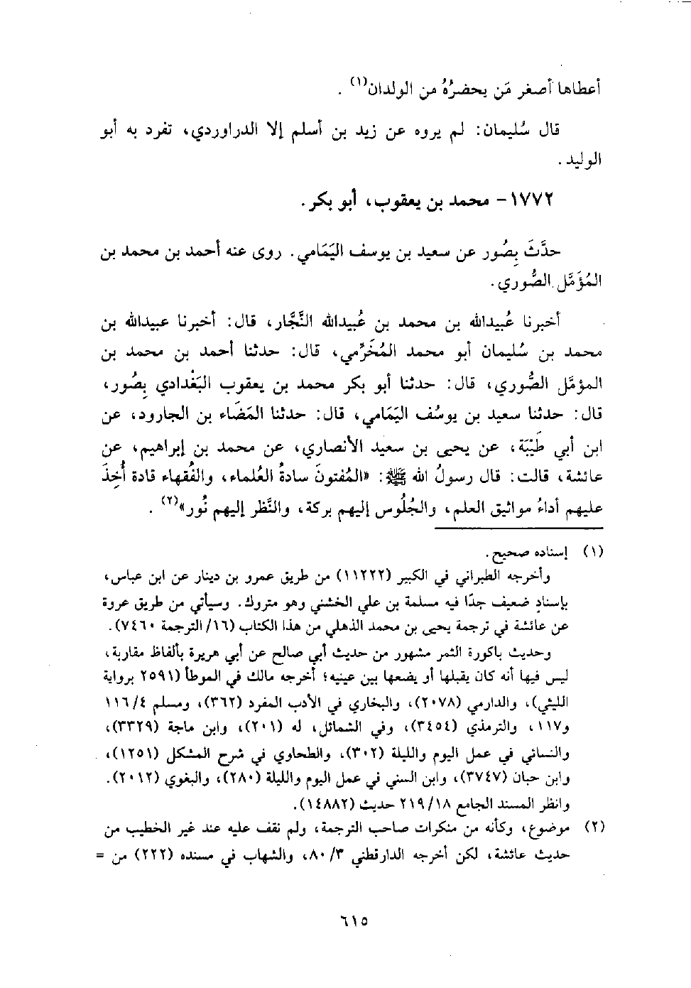 (1173) -[4: 615] أخبرنا عُبَيْدُ اللَّهِ بْنُ مُحَمَّدِ بْنِ عُبَيْدِ اللَّهِ النَّجَّارُ، قَالَ: أخبرنا عُبَيْدُ اللَّهِ بْنُ مُحَمَّدِ بْنِ سُلَيْمَانَ أَبُو مُحَمَّدٍ الْمَخْرَمِيُّ، قَالَ: حَدَّثَنَا أَحْمَدُ بْنُ مُحَمَّدِ بْنِ الْمُؤَمِّلِ الصُّورِيُّ، قَالَ: حَدَّثَنَا أَبُو بَكْرٍ مُحَمَّدُ بْنُ يَعْقُوبَ الْبَغْدَادِيُّ بِصُورَ، قَالَ: حَدَّثَنَا سَعِيدُ بْنُ يُوسُفَ الْيَمَامِيُّ، قَالَ: حَدَّثَنَا الْمَضَاءُ بْنُ الْجَارُودِ، عَنِ ابْنِ أَبِي طَيْبَةَ، عَنْ يَحْيَى بْنِ سَعِيدٍ الأَنْصَارِيِّ، عَنْ مُحَمَّدِ بْنِ إِبْرَاهِيمَ، عَنْ عَائِشَةَ، قَالَتْ: قَالَ رَسُولُ اللَّهِ صَلَّى اللَّهُ عَلَيْهِ وَسَلَّمَ: " الْمُفْتُونَ سَادَةُ الْعُلَمَاءِ، وَالْفُقَهَاءُ قَادَةٌ أُخِذَ عَلَيْهِمْ أَدَاءُ مَوَاثِيقِ الْعِلْمِ، وَالْجُلُوسُ إِلَيْهِمْ بَرَكَةٌ، وَالنَّظَرُ إِلَيْهِمْ نُورٌ "
