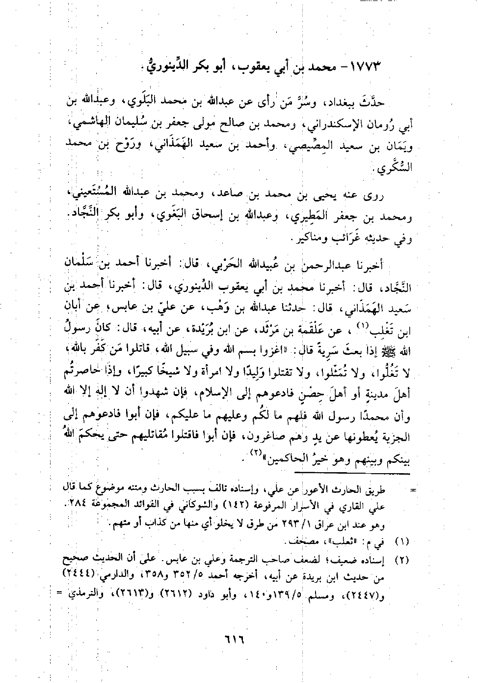 (1174) -[4: 616] أخبرنا عَبْدُ الرَّحْمَنِ بْنُ عُبَيْدِ اللَّهِ الْحَرْبِيُّ، قَالَ: أخبرنا أَحْمَدُ بْنُ سَلْمَانَ النَّجَّادُ، قَالَ: أخبرنا مُحَمَّدُ بْنُ أَبِي يَعْقُوبَ الدَّيْنَوَرِيُّ، قَالَ: أخبرنا أَحْمَدُ بْنُ سَعِيدٍ الْهَمَذَانِيُّ، قَالَ: حَدَّثَنَا عَبْدُ اللَّهِ بْنُ وَهْبٍ، عَنْ عَلِيِّ بْنِ عَابِسٍ، عَنْ أَبَانَ بْنِ تَغْلَبٍ، عَنْ عَلْقَمَةَ بْنِ مَرْثَدٍ، عَنِ ابْنِ بُرَيْدَةَ، عَنْ أَبِيهِ، قَالَ: كَانَ رَسُولُ اللَّهِ صَلَّى اللَّهُ عَلَيْهِ وَسَلَّمَ إِذَا بَعَثَ سَرِيَّةً قَالَ: " اغْزُوا بِسْمِ اللَّهِ وَفِي سَبِيلِ اللَّهِ، قَاتِلُوا مَنْ كَفَرَ بِاللَّهِ، لا تُغْلُوا، وَلا تُمَثِّلُوا، وَلا تَقْلُتُوا وَلِيدًا وَلا امْرَأَةً وَلا شَيْخًا كَبِيرًا، وَإِذَا حَاصَرْتُمْ أَهْلَ مَدِينَةٍ أَوْ أَهْلَ حِصْنٍ فَادْعُوهُمْ إِلَى الإِسْلامِ فَإِنْ شَهِدُوا أَنْ لا إِلَهَ إِلا اللَّهُ وَأَنَّ مُحَمَّدًا رَسُولُ اللَّهِ فَلَهُمْ مَا لَكُمْ وَعَلَيْهِمْ مَا عَلَيْكُمْ فَإِنْ أَبَوْا فَادْعُوهُمْ إِلَى الْجِزْيَةِ يُعْطُونَهَا عَنْ يَدٍ وَهُمْ صَاغِرُونَ، فَإِنْ أَبَوْا فَاقْتُلُوا مُقَاتِلِيهِمْ حَتَّى يَحْكُمَ اللَّهُ بَيْنَكُمْ وَبَيْنَهُمْ وَهُوَ خَيْرُ الْحَاكِمِينَ " أَخْبَرَنِي الحسن بن علي المقرئ، قَالَ: أخبرنا أحمد بن أبي بكر العلاف، قَالَ: أخبرنا محمد بن جعفر المطيري، قَالَ: حَدَّثَنَا محمد بن أبي يعقوب الدينوري بسر من أرى