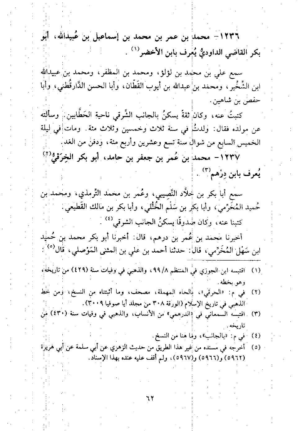 1236 - محمد بن عمر بن محمد بن إسماعيل بن عبيد الله أبو بكر القاضي الداودي يعرف بابن الأخضر سمع علي بن محمد بن لؤلؤ، ومحمد بن المظفر، ومحمد بن عبيد الله بن الشخير، ومحمد بن عبد الله بن أيوب القطان، وأبا الحسن الدارقطني، وأبا حفص بن شاهين.