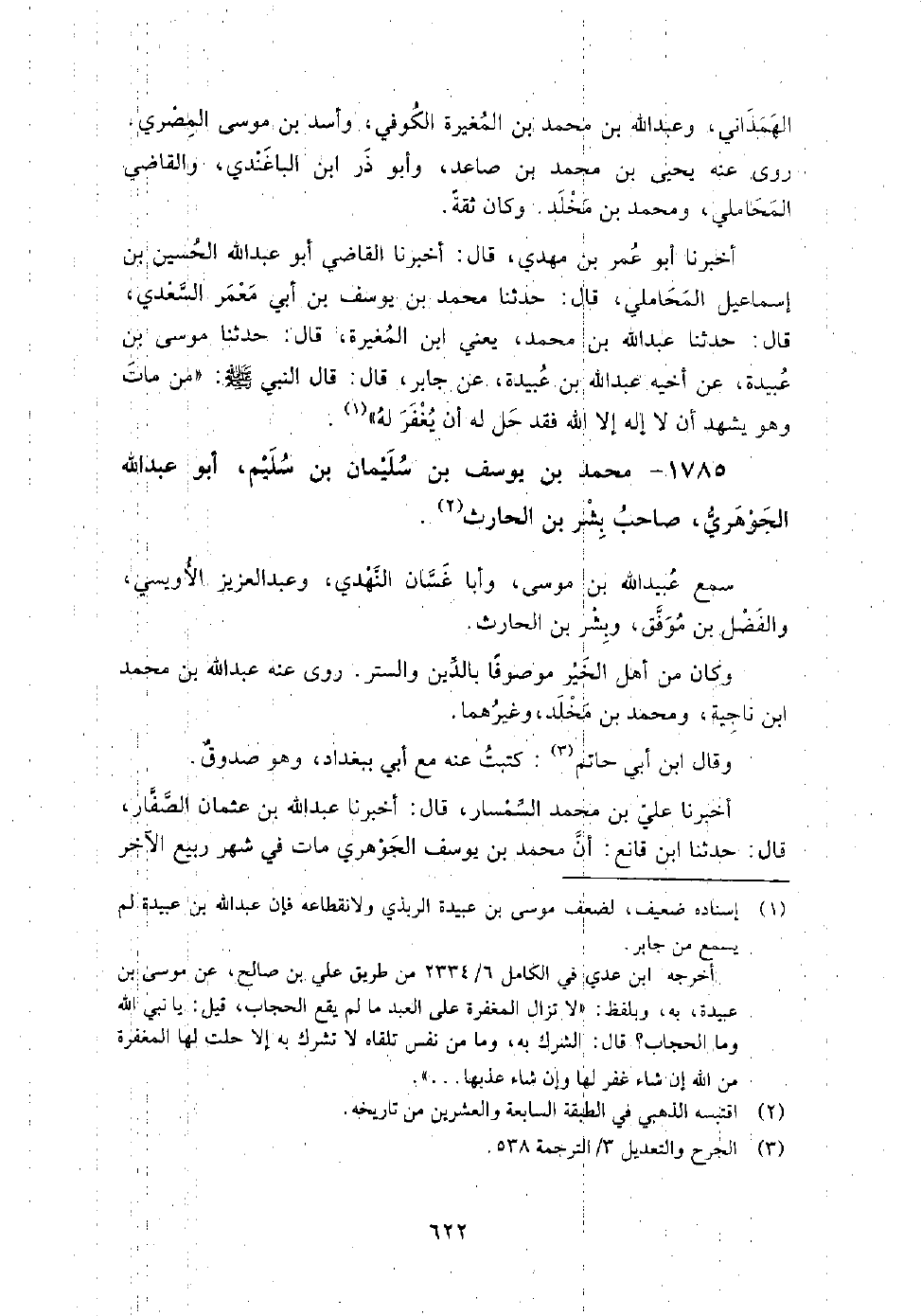 1785 - محمد بن يوسف بن سليمان بن سليم أبو عبد الله الجوهري صاحب بشر بن الحارث سمع عبيد الله بن موسى، وأبا غسان النهدي، وعبد العزيز الأويسي، والفضل بن موفق، وبشر بن الحارث، وكان من أهل الخير موصوفا بالدين والستر.