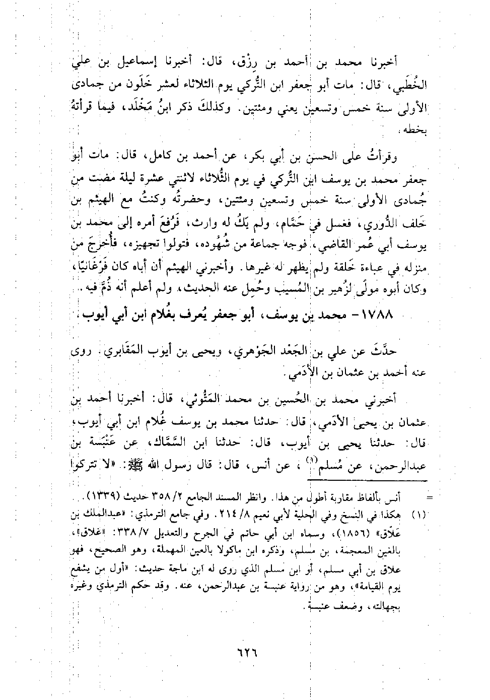 1788 - محمد بن يوسف أبو جعفر يعرف بغلام بن أبي أيوب حدث عن: علي بن الجعد الجوهري، ويحيى بن أيوب المقابري.