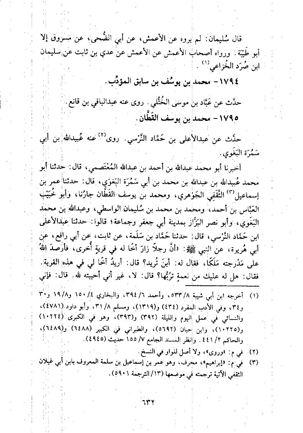 (1188) -[4: 632] أخبرنا أَبُو مُحَمَّدٍ عَبْدُ اللَّهِ بْنُ أَحْمَدَ بْنِ عَبْدِ اللَّهِ الْمُعْتَصِمِيُّ، قَالَ: حَدَّثَنَا أَبُو مُحَمَّدٍ عُبَيْدُ اللَّهِ بْنُ عَبْدِ اللَّهِ بْنِ مُحَمَّدِ بْنِ أَبِي سَمُرَةَ الْبَغَوِيُّ، قَالَ: حَدَّثَنَا عُمَرُ بْنُ إِبْرَاهِيمَ الثَّقَفِيُّ الْجَوْهَرِيُّ وَمُحَمَّدُ بْنُ يُوسُفَ الْقَطَّانُ جَارُنَا، وَأَبُو خبيب الْعَبَّاسُ بْنُ أَحْمَدَ وَمُحَمَّدُ بْنُ مُحَمَّدِ بْنِ سُلَيْمَانَ الْوَاسِطِيُّ وَعَبْدُ اللَّهِ بْنُ مُحَمَّدٍ الْبَغَوِيُّ وَأَبُو نَصْرٍ الْبَزَّازُ بِمَدِينَةِ أَبِي جَعْفَرٍ وَجَمَاعَةٌ؛ قَالُوا: حَدَّثَنَا عَبْدُ الأَعْلَى بْنُ حَمَّادٍ النَّرْسِيُّ، قَالَ: حَدَّثَنَا حَمَّادُ بْنُ سَلَمَةَ، عَنْ ثَابِتٍ، عَنْ أَبِي رَافِعٍ، عَنْ أَبِي هُرَيْرَةَ، عَنِ النَّبِيِّ صَلَّى اللَّهُ عَلَيْهِ وَسَلَّمَ: " أَنَّ رَجُلا زَارَ أَخًا لَهُ فِي قَرْيَةٍ أُخْرَى، فَأَرْصَدَ اللَّهُ عَلَى مَدْرَجَتِهِ مَلَكًا، فَقَالَ لَهُ: أَيْنَ تُرِيدُ؟ قَالَ: أُرِيدُ أَخًا لِي فِي هَذِهِ الْقَرْيَةِ.