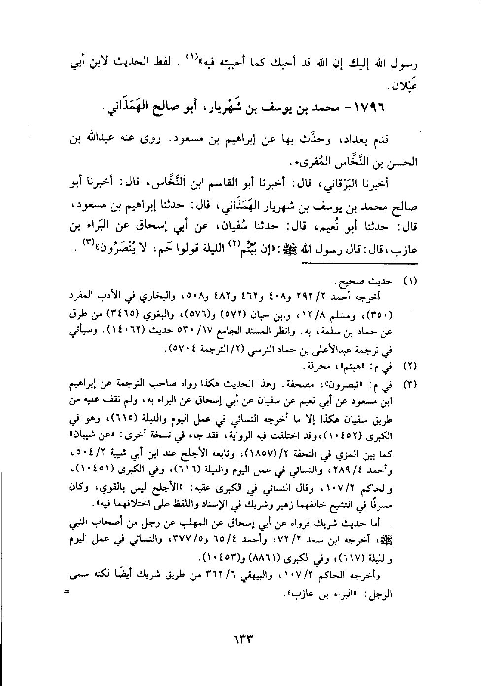 1796 - محمد بن يوسف بن شهريار أبو صالح الهمذاني قدم بغداد، وحدث بها عن إبراهيم بن مسعود.