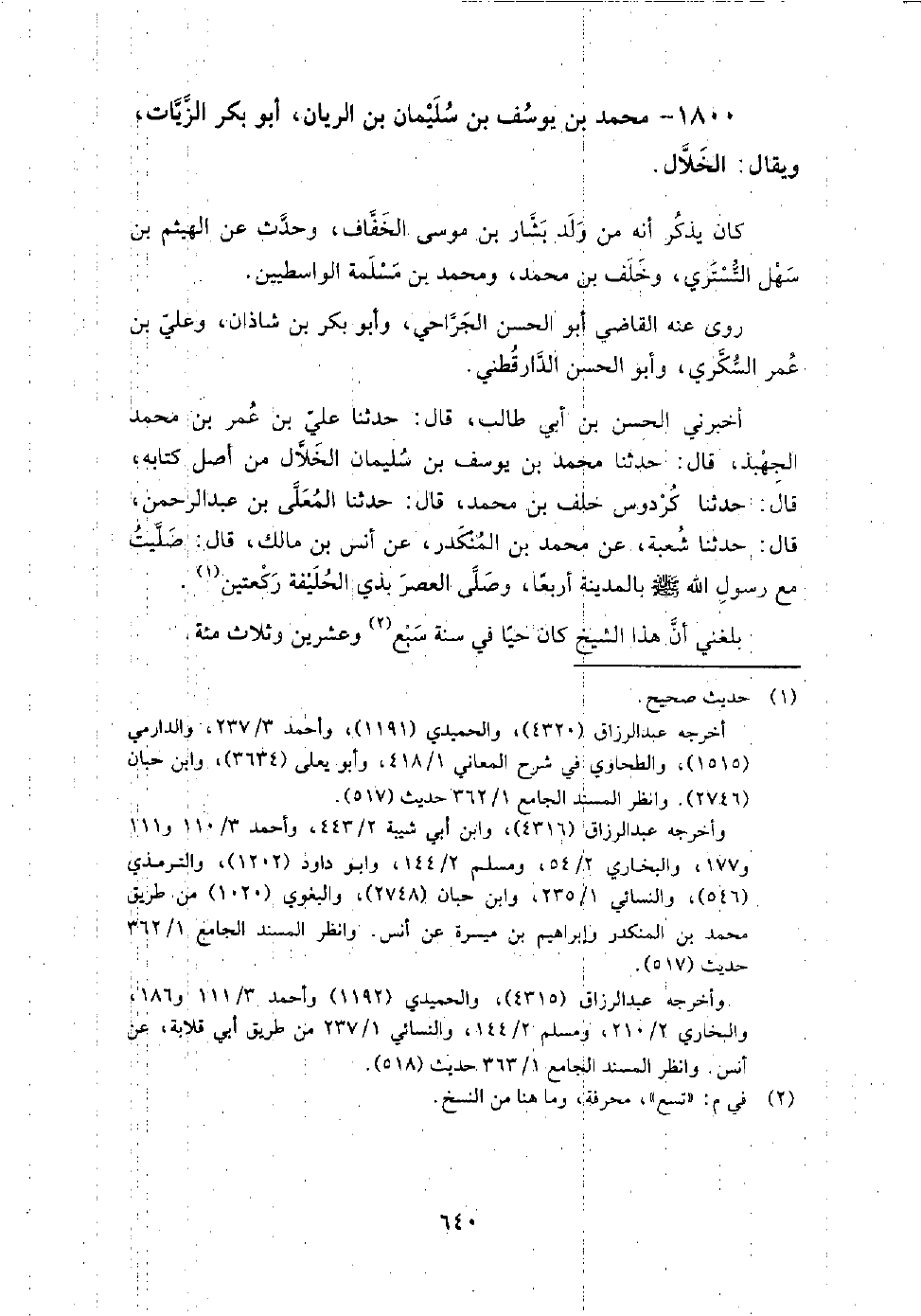 1800 - محمد بن يوسف بن سليمان بن الريان أبو بكر الزيات ويقال الخلال كان يذكر أنه من ولد بشار بن موسى الخفاف، وحدث عن الهيثم بن سهل التستري، وخلف بن محمد، ومحمد بن مسلمة الواسطيين.