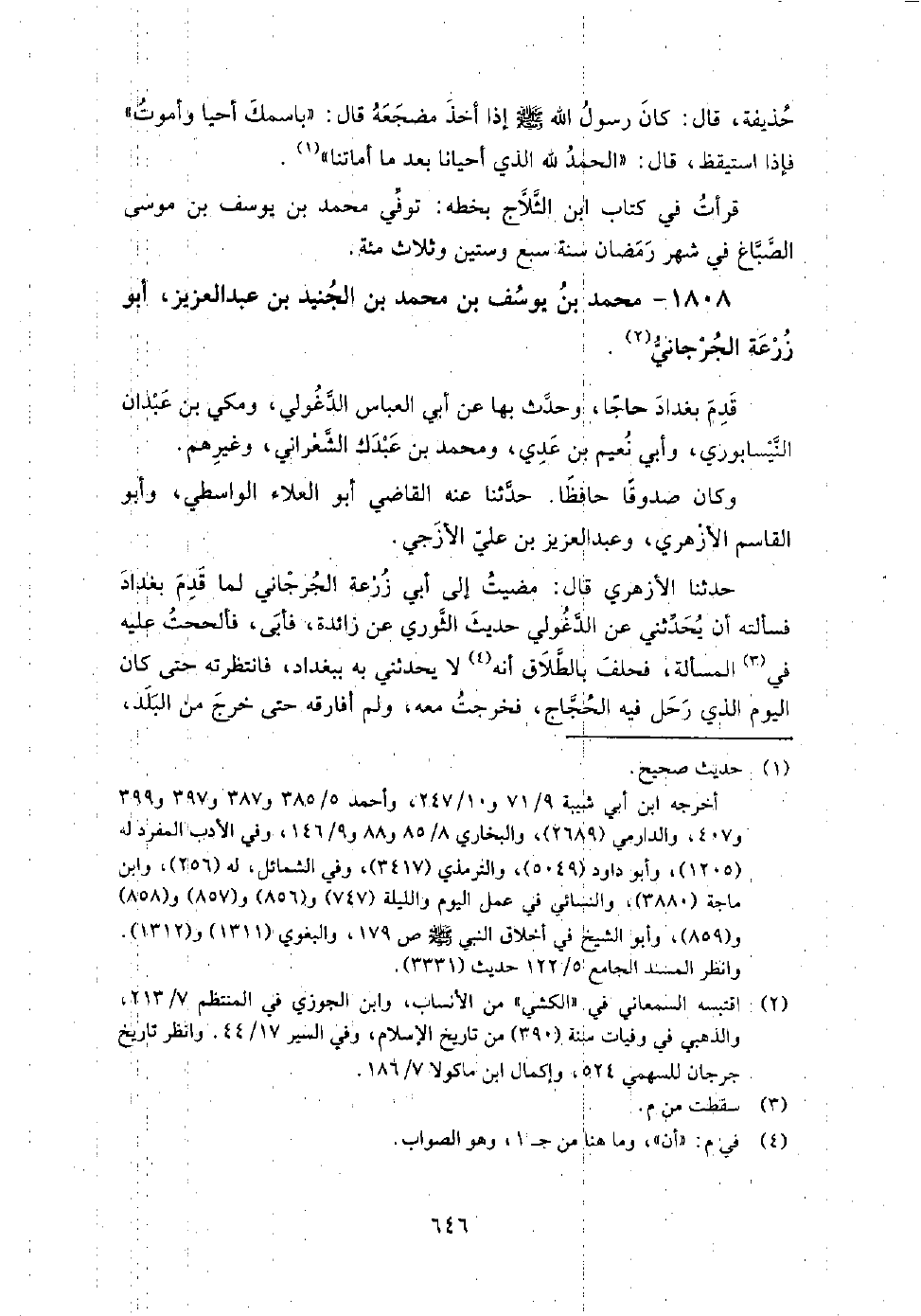 1808 - محمد بن يوسف بن محمد بن الجنيد بن عبد العزيز أبو زرعة الجرجاني قدم بغداد حاجا، وحدث بها عن أبي العباس الدغولي، ومكي بن عبدان النيسابوري، وأبي نعيم بن عدي، ومحمد بن عبدك الشعراني، وغيرهم.