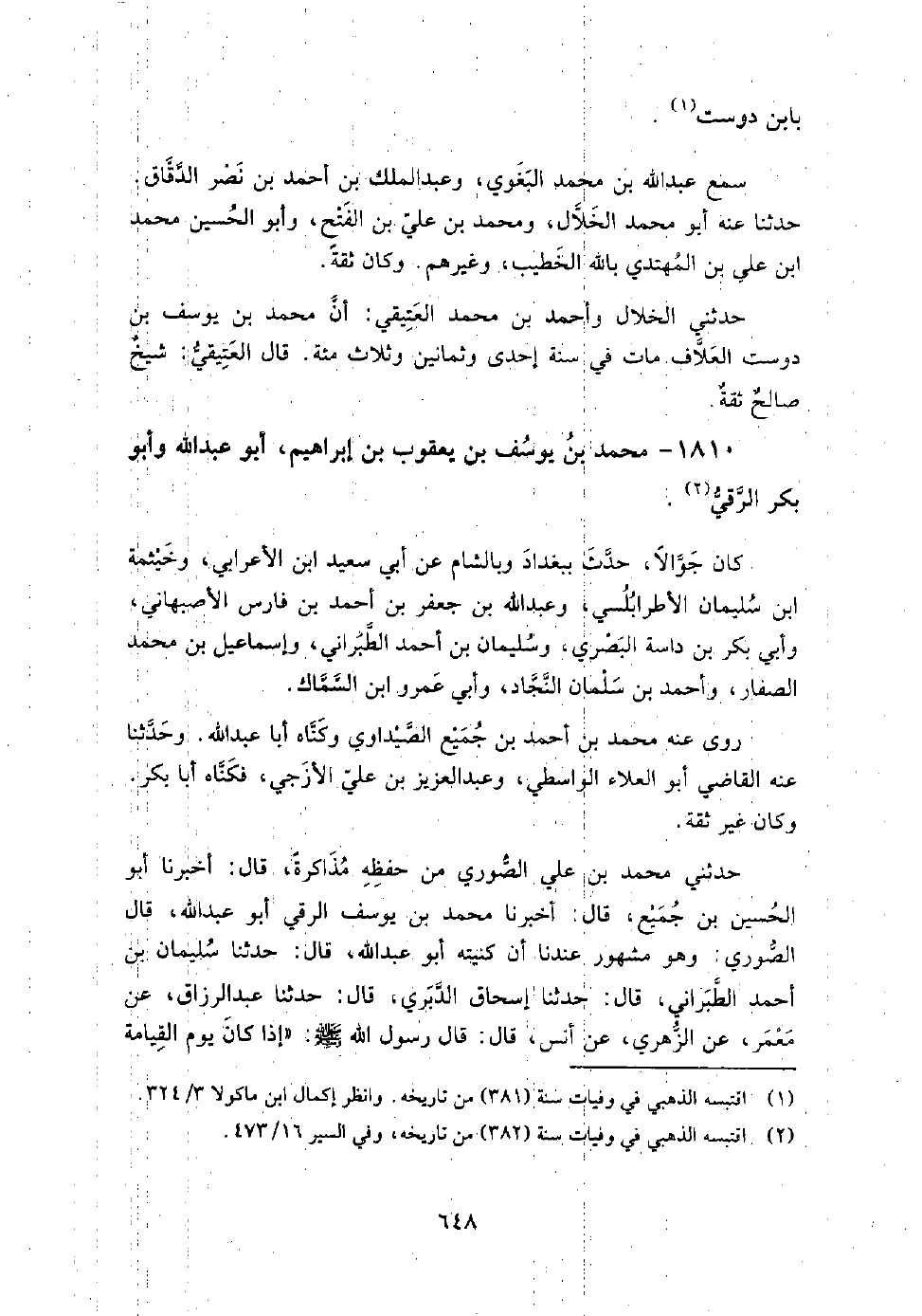 وهذه الحكاية باطلة، لأن هشيما انتقل قديما عن واسط إلى بغداد فسكنها، وبها كانت وفاته سنه ثلاث وثمانين ومائة، ولابن المنادي إذ ذاك اثنتي عشرة سنة، وسمع من أبي هدبة ببغداد بعد موت هشيم بمدة طويلة، ولا نعلم له سماعا إلا بعد سنه تسعين ومائة قَالَ: والله أعلم قَالَ لي أبو العلاء الواسطي: كان هذا الرقى يكتنى بأبي بكر وأبي عبد الله، وسمعت منه مع أبي عبد الله بن بكير في سنة اثنتين وثمانين وثلاث مائة.