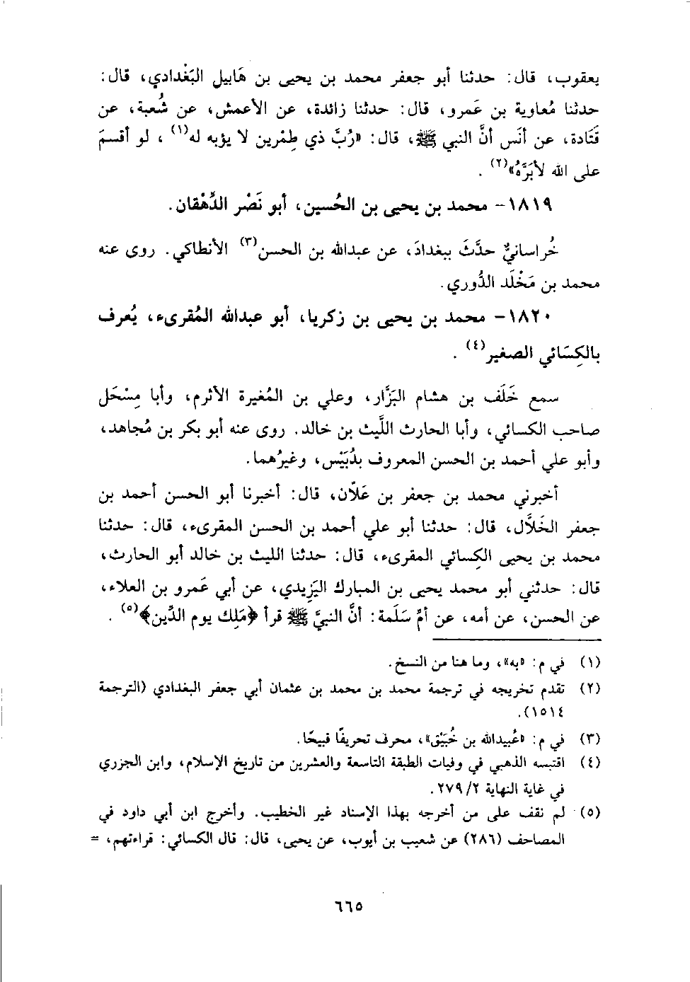 1820 - محمد بن يحيى بن زكريا أبو عبد الله المقرئ يعرف بالكسائي الصغير سمع خلف بن هاشم البزار، وعلي بن المغيرة الأثرم، وأبا مسحل صاحب الكسائي، وأبا الحارث الليث بن خالد.