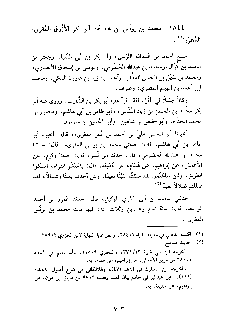 1844 - محمد بن يونس بن عبد الله أبو بكر الأزرق المقرئ المطرز سمع أحمد بن عبيد الله النرسي، وأبا بكر بن أبي الدنيا، وجعفر بن محمد بن كزال، ومحمد بن عبد الله الحضرمي، وموسى بن إسحاق الأنصاري، ومحمد بن سهل بن الحسن العطار، وأحمد بن زيد بن هارون المكي، ومحمد بن أحمد بن الهيثم المصري، وغيرهم.