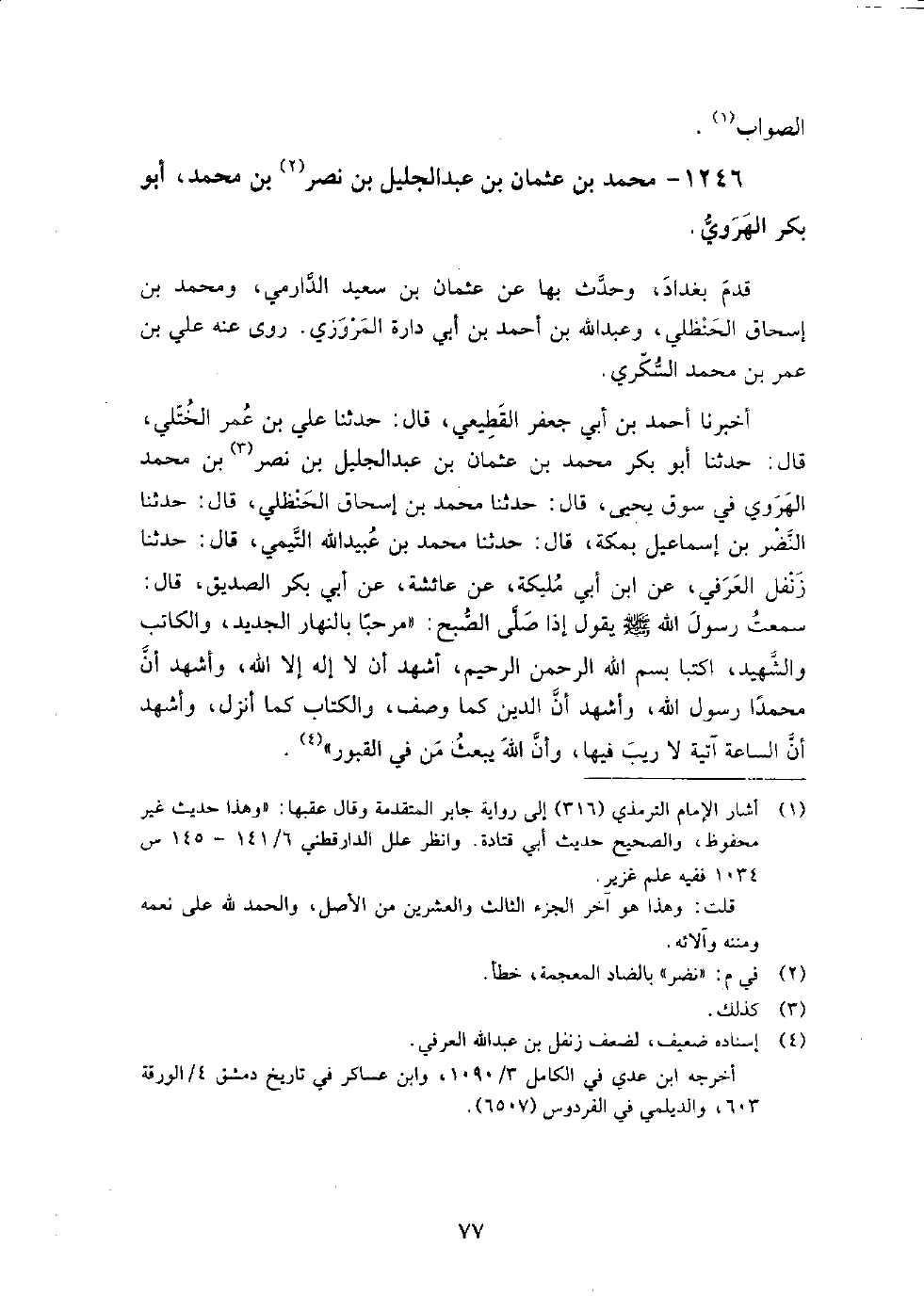 1246 - محمد بن عثمان بن عبد الجليل بن نصر بن محمد أبو بكر الهروي قدم بغداد، وحدث بها عن عثمان بن سعيد الدارمي، ومحمد بن إسحاق الحنظلي، وعبد الله بن أحمد بن أبي دارة المروزي.