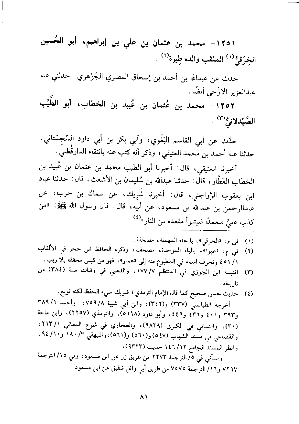 1251 - محمد بن عثمان بن علي بن إبراهيم، أبو الحسين الخرقى الملقب والده طيرة حدث عن: عبد الله بن أحمد بن إسحاق المصري الجوهري، حَدَّثَنِي عنه عبد العزيز الأزجي أيضا.