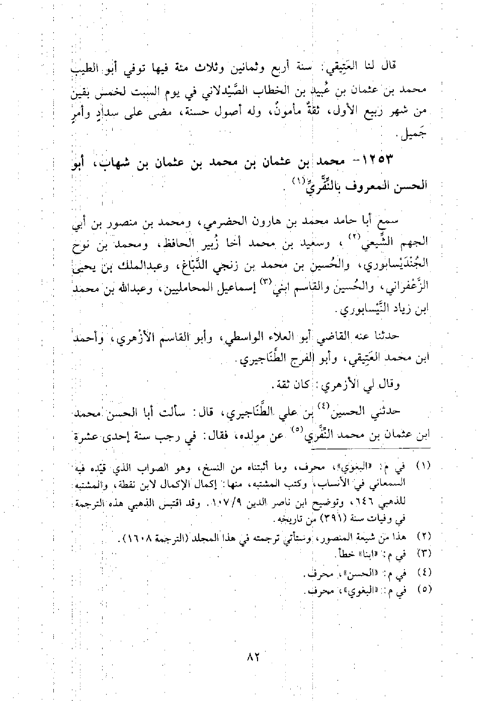1253 - محمد بن عثمان بن محمد بن عثمان بن شهاب أبو الحسن المعروف بالنفري سمع أبا حامد محمد بن هارون الحضرمي، ومحمد بن منصور بن أبي الجهم الشيعي، وسعيد بن محمد أخا زبير الحافظ، ومحمد بن نوح الجنديسابوري، والحسين بن محمد بن زنجي الدباغ، وعبد الملك بن يحيى الزعفراني، والحسين والقاسم ابني إسماعيل المحامليين، وعبد الله بن محمد بن زياد النيسابوري.