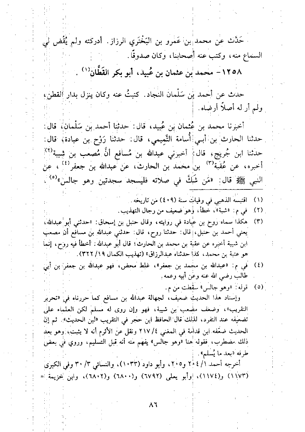 (852) -[4: 86] أَخْبَرَنَا مُحَمَّدُ بْنُ عُثْمَانَ بْنِ عُبَيْدٍ، قَالَ: حَدَّثَنَا أَحْمَدُ بْنُ سَلْمَانَ، قَالَ: حَدَّثَنَا الْحَارِثُ بْنُ أَبِي أُسَامَةَ التَّمِيمِيُّ، قَالَ: حَدَّثَنَا رَوْحُ بْنُ عُبَادَةَ، قَالَ: حَدَّثَنَا ابْنِ جُرَيْجٍ، قَالَ: أَخْبَرَنِي عَبْدُ اللَّهِ بْنُ مُسَافِعٍ أَنَّ مُصْعَبَ بْنَ شَيبَةَ، أَخْبَرَهُ عَنْ عُقْبَةَ بْنِ مُحَمَّدِ بْنِ الْحَارِثِ، عَنْ عَبْدِ اللَّهِ بْنِ جَعْفَرٍ، عَنِ النَّبِيِّ صَلَّى اللَّهُ عَلَيْهِ وَسَلَّمَ قَالَ: " مَنْ شَكَّ فِي صَلاتِهِ فَلْيَسْجُدْ سَجْدَتَيْنِ وَهُوَ جَالِسٌ " سمعت منه في صفر من سنة تسع وأربع مائة.